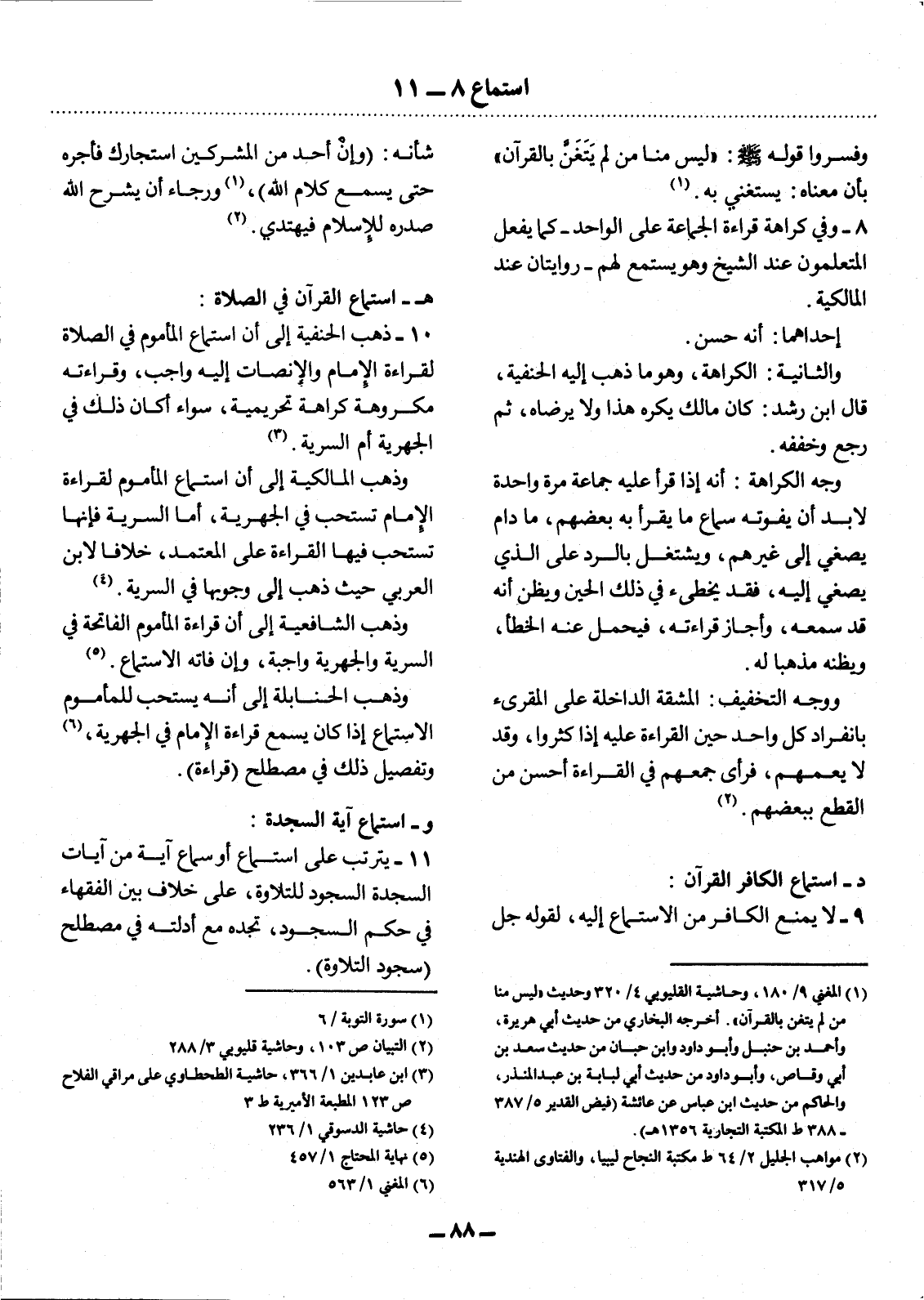 (1) المغني 9 / 180، وحاشية القليوبي 4 / 320 وحديث " ليس منا من لم يتغن بالقرآن ". أخرجه البخاري من حديث أبي هريرة، وأحمد بن حنبل وأبو داود وابن حبان من حديث سعد بن أبي وقاص، وأبو داود من حديث أبي لبابة بن عبد المنذر، والحاكم من حديث ابن عباس عن عائشة (فيض القدير 5 / 387 - 388 ط المكتبة التجارية 1356 هـ) .