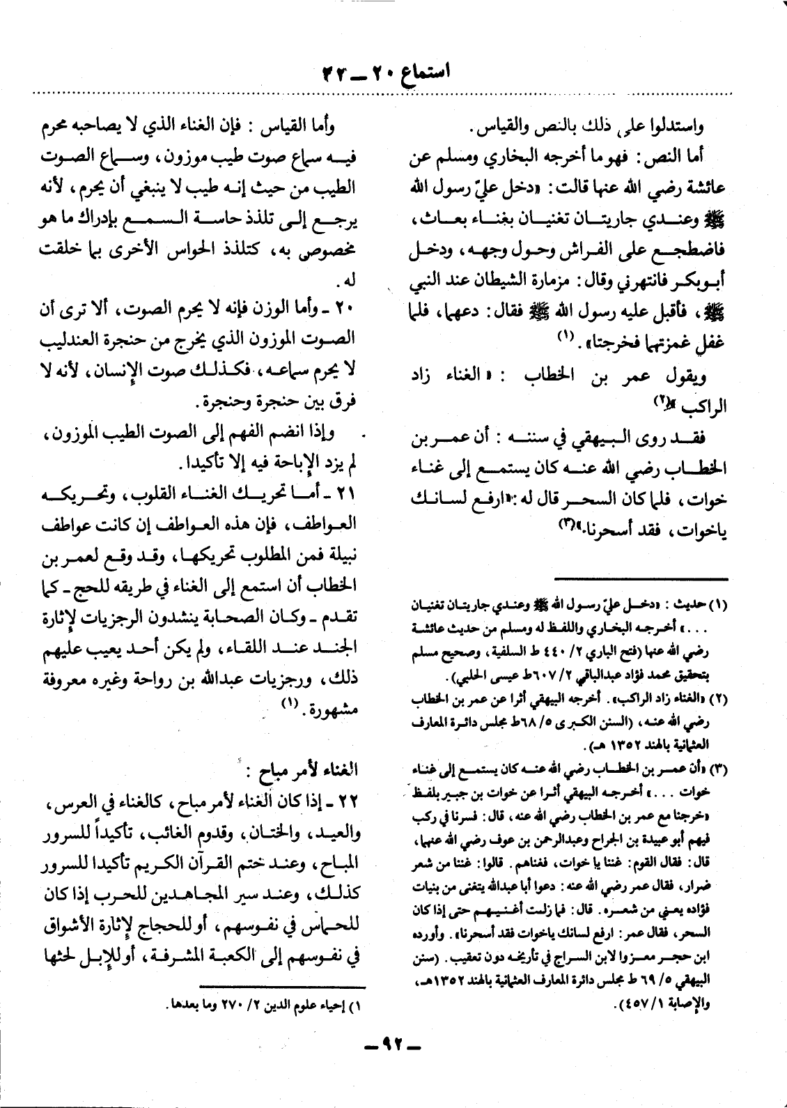 (1) حديث: " دخل علي رسول الله صلى الله عليه وسلم وعندي جاريتان تغنيان. . . " أخرجه البخاري واللفظ له ومسلم من حديث عائشة رضي الله عنها (فتح الباري 2 / 440 ط السلفية، وصحيح مسلم بتحقيق محمد فؤاد عبد الباقي 2 / 607 ط عيسى الحلبي) .