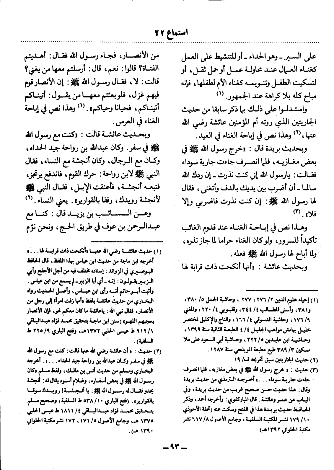(2) حديث: " أن عائشة رضي الله عنها قالت: كنت مع رسول الله صلى الله عليه وسلم في سفر وكان عبد الله بن رواحة جيد الحداء. . . ". أخرجه البخاري ومسلم من حديث أنس بن مالك، ولفظ مسلم " كان رسول الله صلى الله عليه وسلم في بعض أسفاره، وغلام أسود يقال له: أنجشة يحدو فقال له رسول الله صلى الله عليه وسلم: يا أنجشة! رويدك سوقا بالقوارير ". (فتح الباري 10 / 538 ط السلفية، وصحيح مسلم بتحقيق محمد فؤاد عبد الباقي 4 / 1811 ط عيسى الحلبي 1375 هـ، وجامع الأصول 5 / 171، 172 نشر مكتبة الحلواني 1390 هـ) .