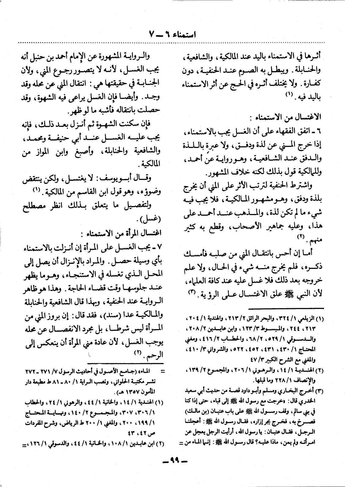 (3) أخرج البخاري ومسلم وأبو داود قصة من حديث أبي سعيد الخدري قال: " خرجت مع رسول الله صلى الله عليه وسلم إلى قباء، حتى إذا كنا في بني سالم، وقف رسول الله صلى الله عليه وسلم على باب عتبان (بن مالك) فصرخ به، فخرج يجر إزاره، فقال رسول الله صلى الله عليه وسلم: أعجلنا الرجل ماذا عليه؟ قال رسول الله صلى الله عليه وسلم: إنما الماء من الماء " (جامع الأصول في أحاديث الرسول 7 / 271 - 272 نشر مكتبة الحلواني، ونصب الراية 1 / 80 - 81 ط مطبعة دار المأمون 1357 هـ) .