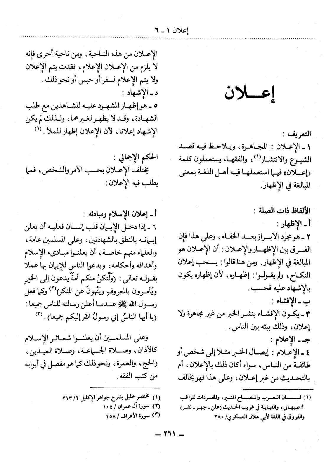 (1) لسان العرب والمصباح المنير، والمفردات للراغب الأصبهاني، والنهاية في غريب الحديث (علن - جهر - نشر) والفروق في اللغة لأبي هلال العسكري / 280.