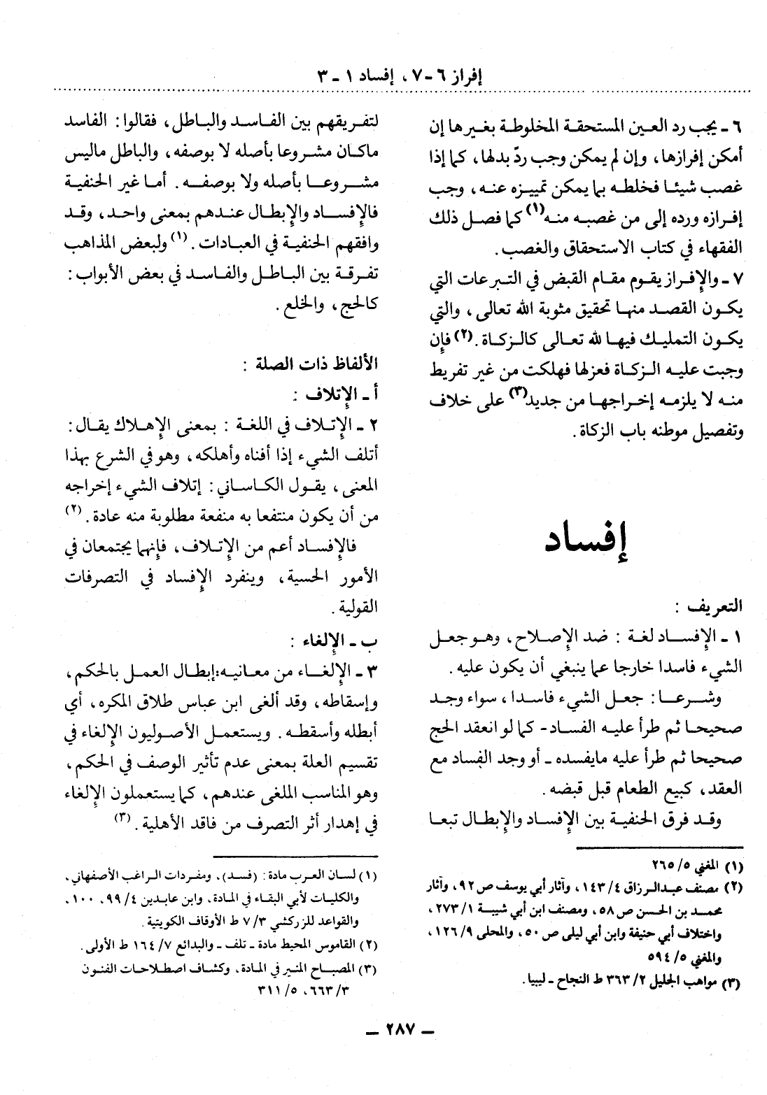 (1) لسان العرب مادة: (فسد) ، ومفردات الراغب الأصفهاني، والكليات لأبي البقاء في المادة، وابن عابدين 4 / 99، 100، والقواعد للزركشي 3 / 7 ط الأوقاف الكويتية.