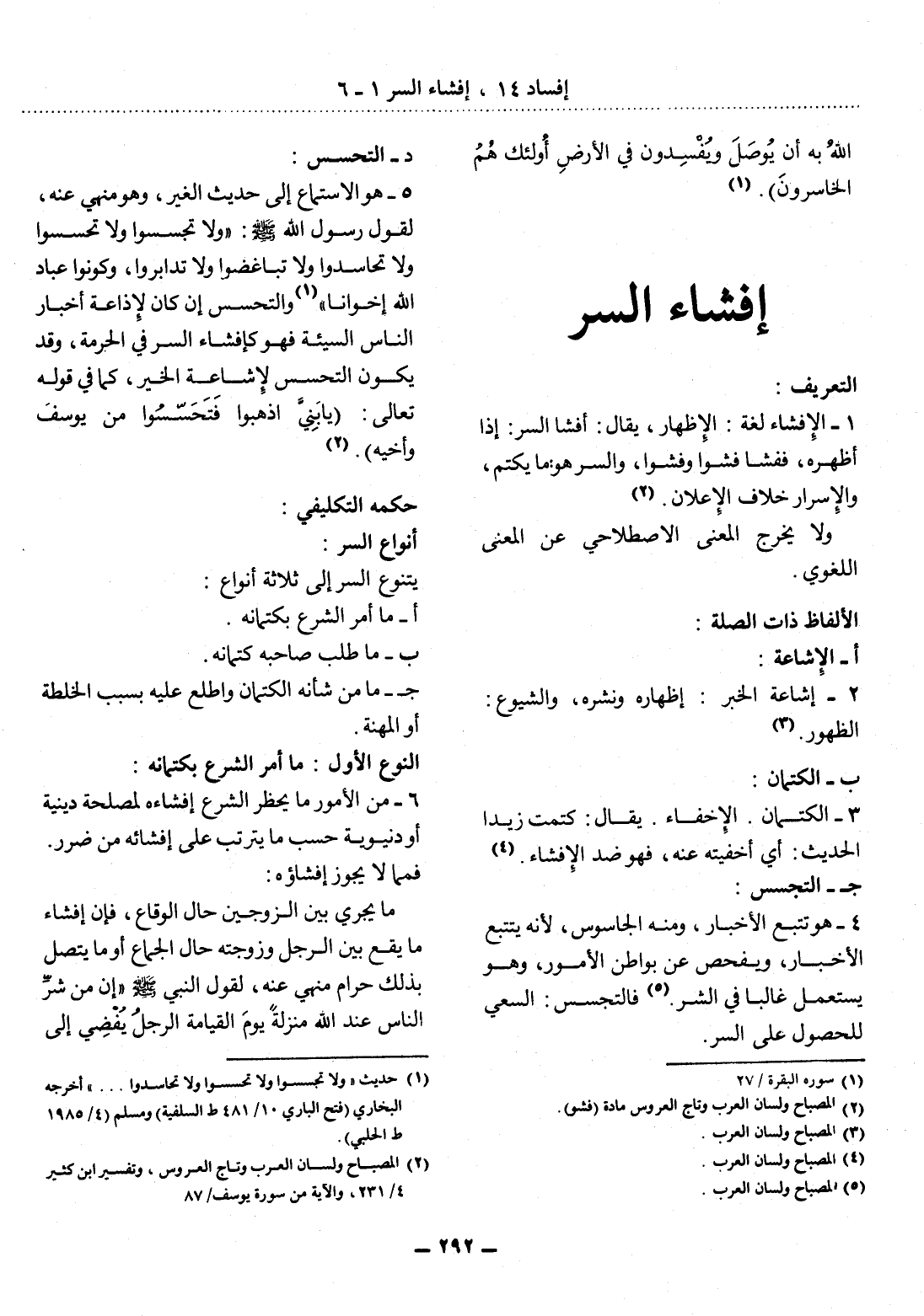 (1) حديث " ولا تجسسوا ولا تحسسوا ولا تحاسدوا. . . " أخرجه البخاري (فتح الباري 10 / 481 ط السلفية) ومسلم (4 / 1985 ط الحلبي) .