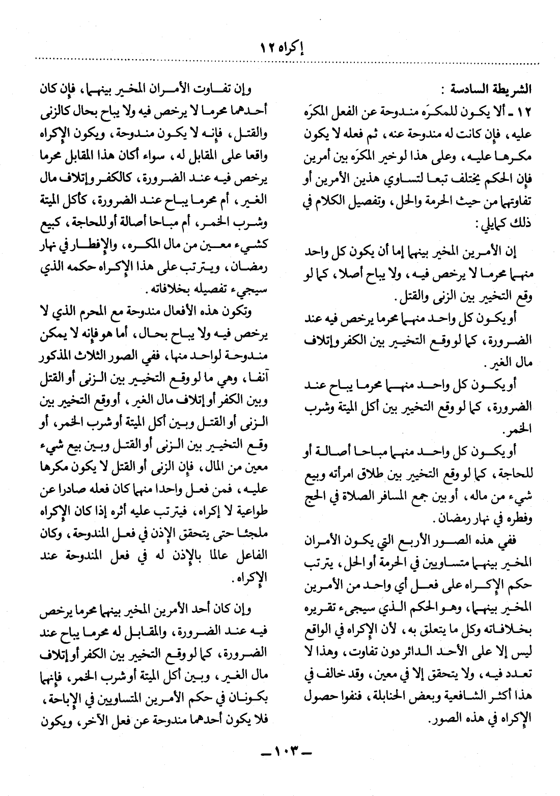 12 - أَلاَّ يَكُونَ لِلْمُكْرَهِ مَنْدُوحَةٌ عَنِ الْفِعْل الْمُكْرَهِ عَلَيْهِ، فَإِنْ كَانَتْ لَهُ مَنْدُوحَةٌ عَنْهُ، ثُمَّ فَعَلَهُ لاَ يَكُونُ مُكْرَهًا عَلَيْهِ، وَعَلَى هَذَا لَوْ خُيِّرَ الْمُكْرَهُ بَيْنَ أَمْرَيْنِ فَإِنَّ الْحُكْمَ يَخْتَلِفُ تَبَعًا لِتَسَاوِي هَذَيْنِ الأَْمْرَيْنِ أَوْ تَفَاوُتِهِمَا مِنْ حَيْثُ الْحُرْمَةُ وَالْحِل، وَتَفْصِيل الْكَلاَمِ فِي ذَلِكَ كَمَا يَلِي: