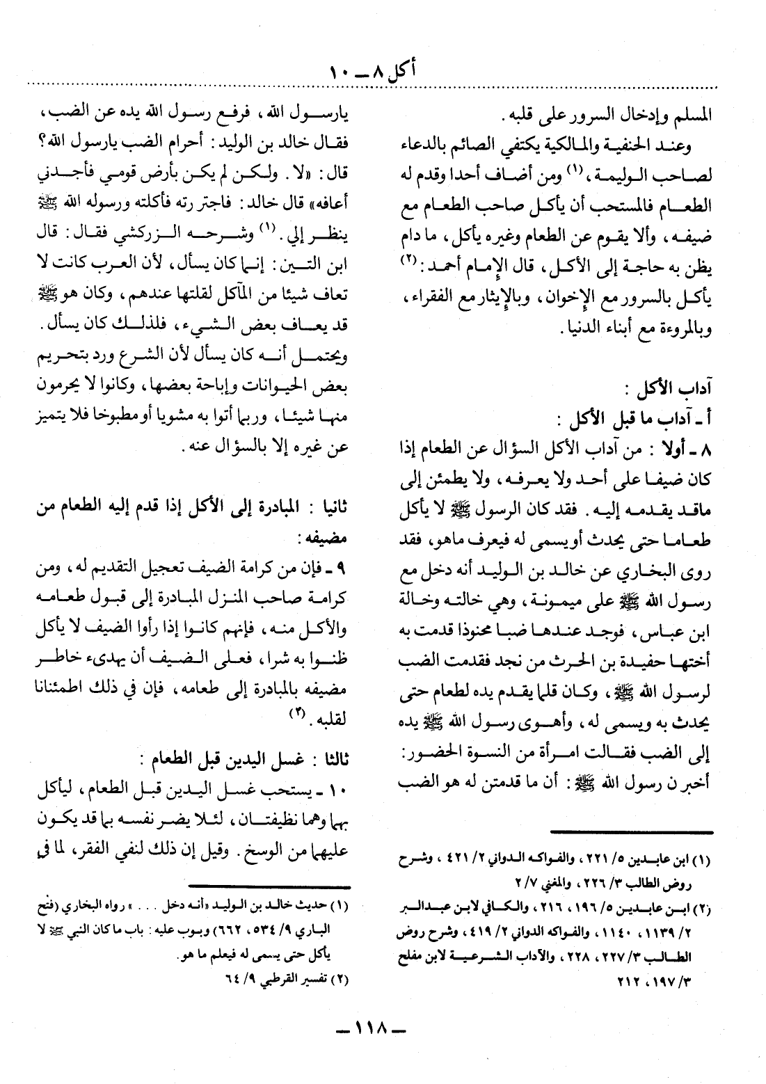 (1) حديث خالد بن الوليد " أنه دخل. . . " رواه البخاري (فتح الباري 9 / 534، 662) وبوب عليه. باب ما كان النبي صلى الله عليه وسلم لا يأكل حتى يسمى له فيعلم ما هو.