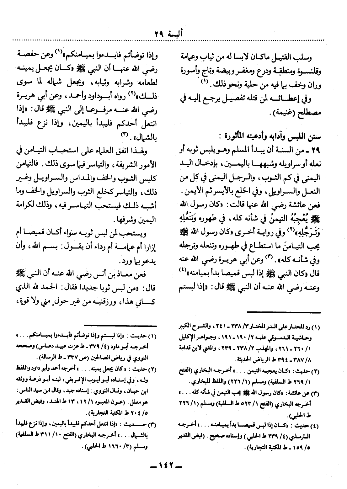 29 - مِنَ السُّنَّةِ أَنْ يَبْدَأَ الْمُسْلِمُ وَهُوَ يَلْبَسُ ثَوْبَهُ أَوْ نَعْلَهُ أَوْ سَرَاوِيلَهُ وَشِبْهَهَا بِالْيَمِينِ، بِإِدْخَال الْيَدِ الْيُمْنَى فِي كُمِّ الثَّوْبِ، وَالرِّجْل الْيُمْنَى فِي كُلٍّ مِنَ النَّعْل وَالسَّرَاوِيل، وَفِي الْخَلْعِ بِالأَْيْسَرِ ثُمَّ الأَْيْمَنِ.