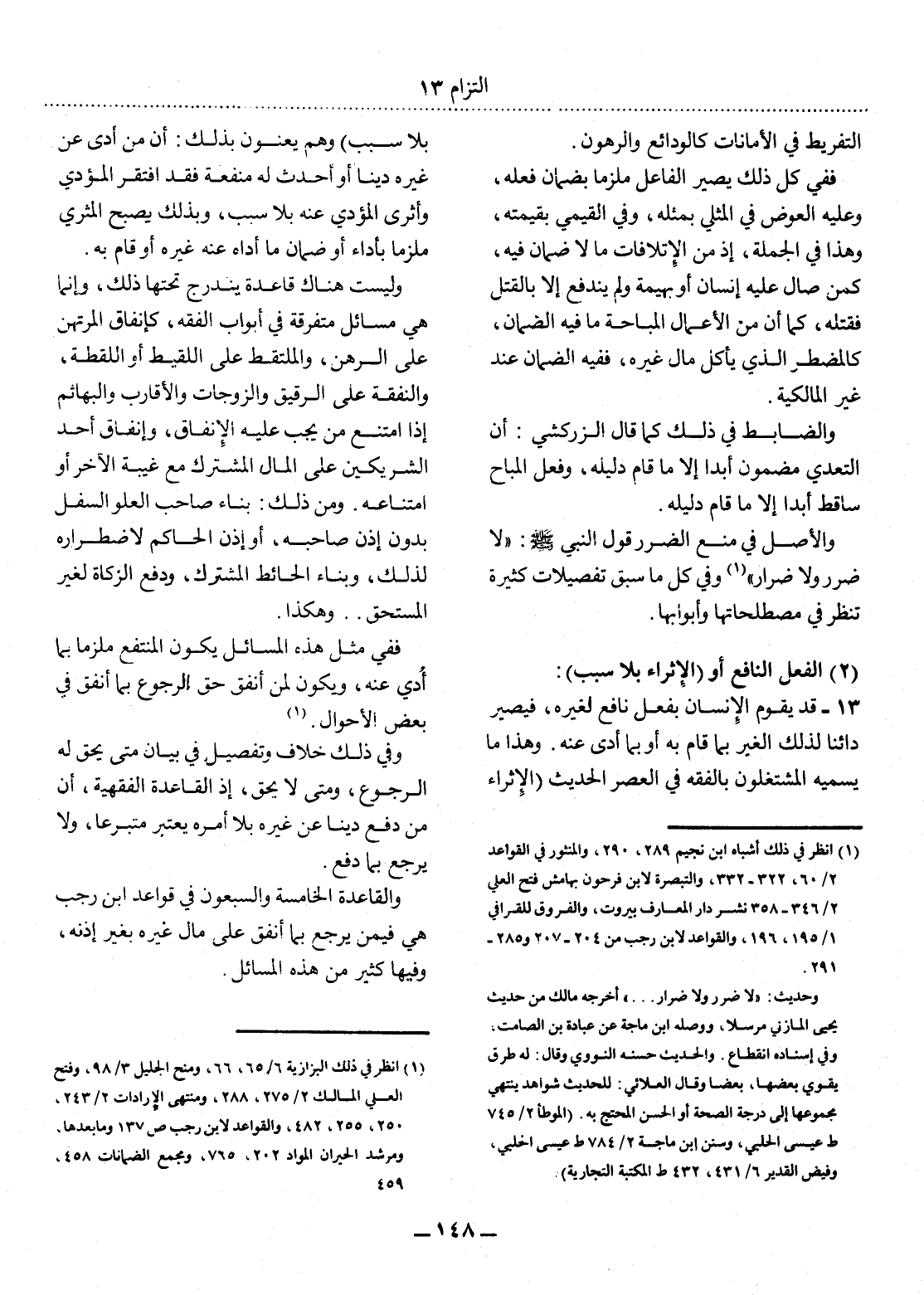 (1) انظر في ذلك أشباه ابن نجيم 289، 290، والمنثور في القواعد 2 / 60، 322 - 332، والتبصرة لابن فرحون بهامش فتح العلي 2 / 346 - 358 نشر دار المعارف بيروت، والفروق للقرافي 1 / 195، 196، والقواعد لابن رجب من 204 - 207 و285 - 291. وحديث: " لا ضرر ولا ضرار. . . . " أخرجه مالك من حديث يحيى المازني مرسلا، ووصله ابن ماجه عن عبادة بن الصامت: وفي إسناده انقطاع. والحديث حسنه النووي وقال: له طرق يقوي بعضها بعضا وقال العلائي: للحديث شواهد ينتهي مجموعها إلى درجة الصحة أو الحسن المحتج به. (الموطأ 2 / 745 ط عيسى الحلبي، وسنن ابن ماجه 2 / 784 ط عيسى الحلبي، وفيض القدير 6 / 431، 432 ط المكتبة التجارية)