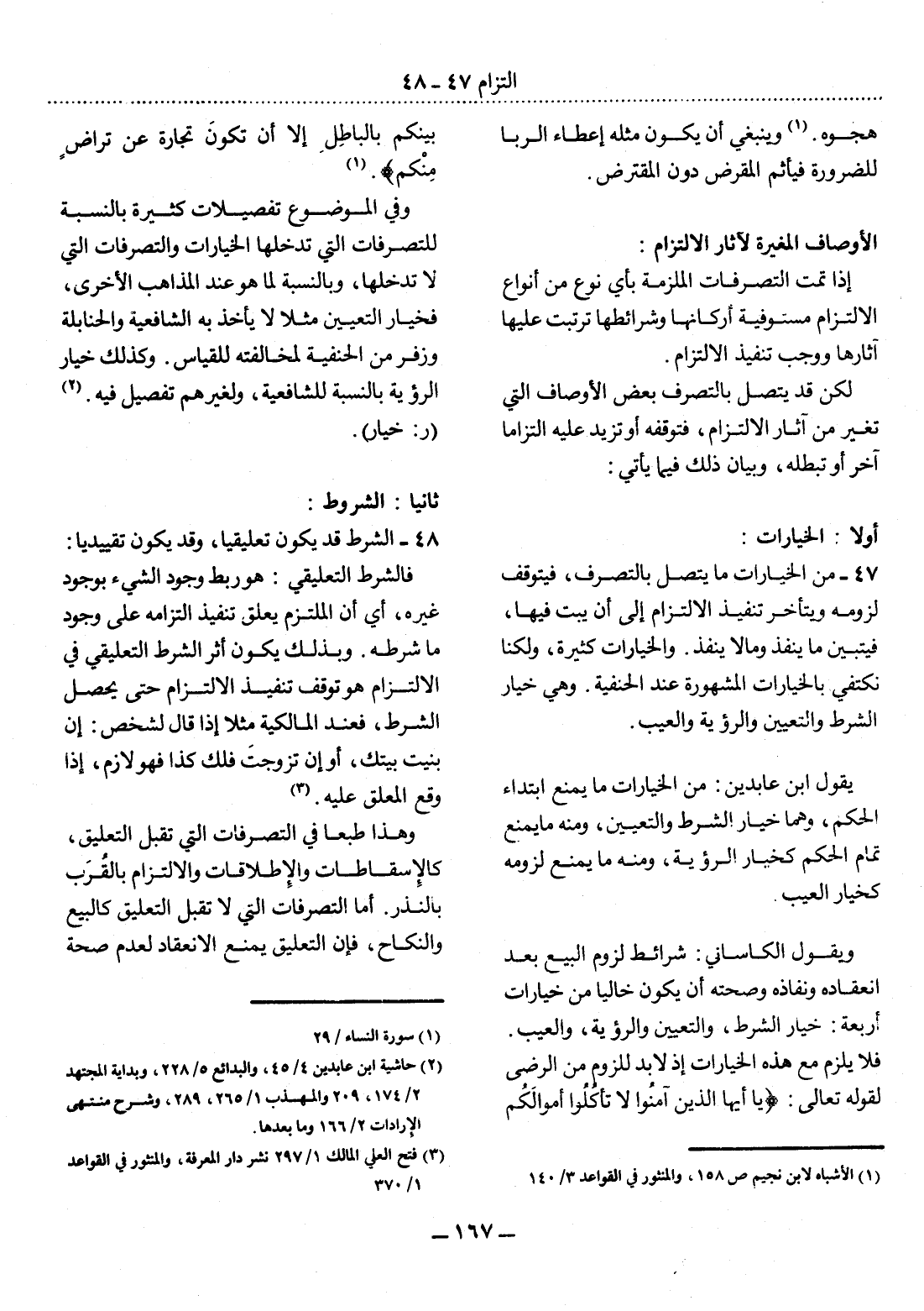 47 - مِنَ الْخِيَارَاتِ مَا يَتَّصِل بِالتَّصَرُّفِ، فَيَتَوَقَّفُ لُزُومُهُ وَيَتَأَخَّرُ تَنْفِيذُ الاِلْتِزَامِ إِلَى أَنْ يُبَتَّ فِيهَا، فَيَتَبَيَّنَ مَا يَنْفُذُ وَمَا لاَ يَنْفُذُ. وَالْخِيَارَاتُ كَثِيرَةٌ، وَلَكِنَّا نَكْتَفِي بِالْخِيَارَاتِ الْمَشْهُورَةِ عِنْدَ الْحَنَفِيَّةِ. وَهِيَ خِيَارُ الشَّرْطِ وَالتَّعْيِينِ وَالرُّؤْيَةِ وَالْعَيْبِ.