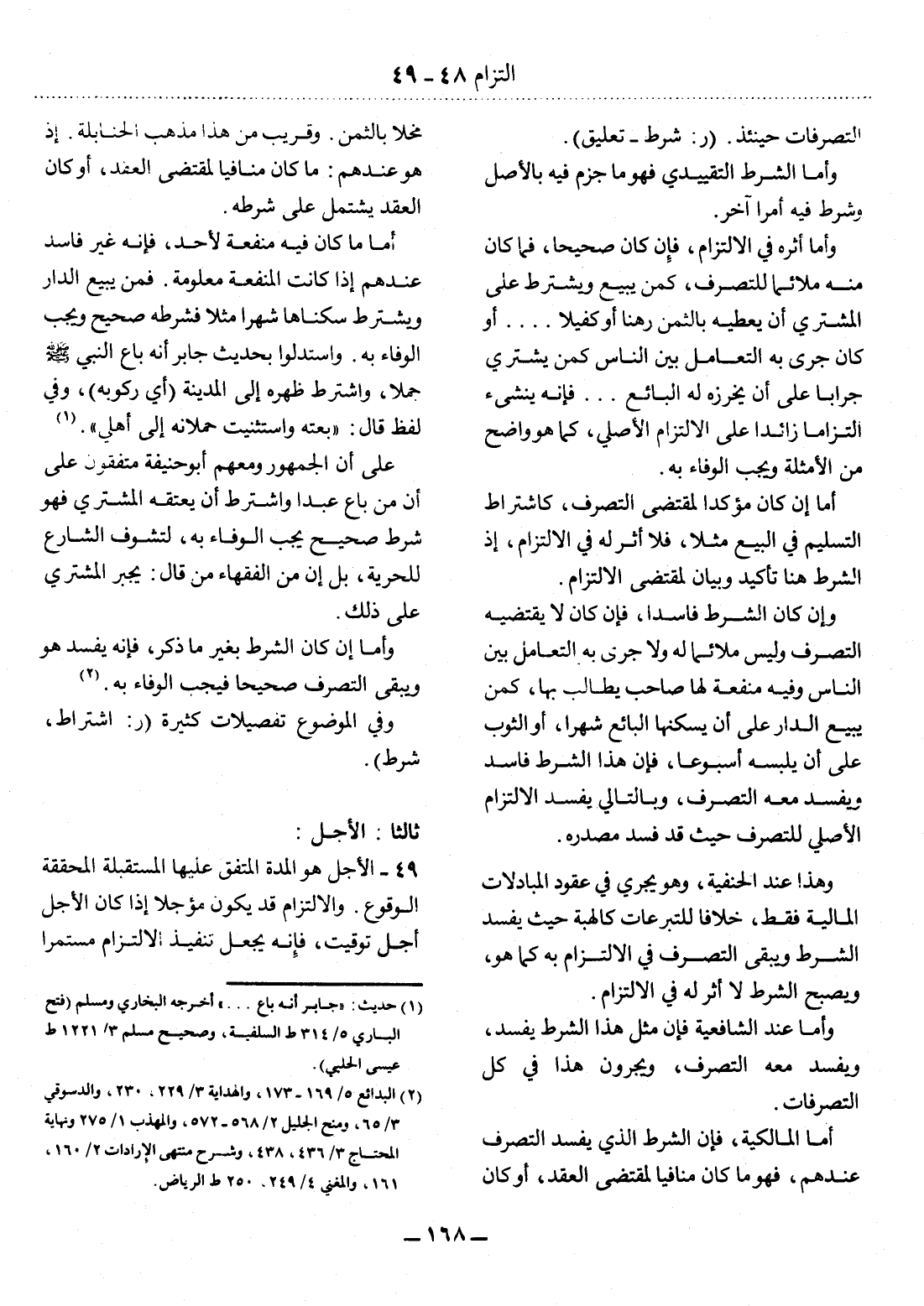 49 - الأَْجَل هُوَ الْمُدَّةُ الْمُتَّفَقُ عَلَيْهَا الْمُسْتَقْبَلَةُ الْمُحَقَّقَةُ الْوُقُوعِ. وَالاِلْتِزَامُ قَدْ يَكُونُ مُؤَجَّلاً إِذَا كَانَ الأَْجَل أَجَل تَوْقِيتٍ، فَإِنَّهُ يَجْعَل تَنْفِيذَ الاِلْتِزَامِ مُسْتَمِرًّا