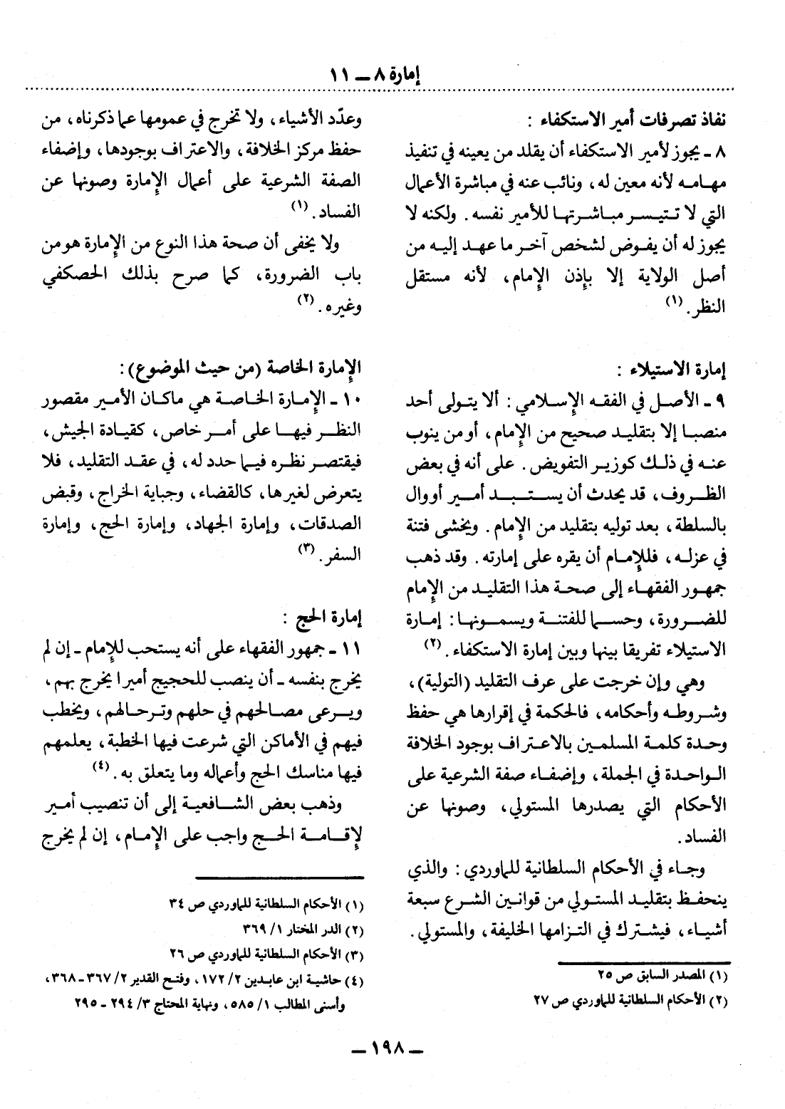 10 - الإِْمَارَةُ الْخَاصَّةُ هِيَ مَا كَانَ الأَْمِيرُ مَقْصُورَ النَّظَرِ فِيهَا عَلَى أَمْرٍ خَاصٍّ، كَقِيَادَةِ الْجَيْشِ، فَيَقْتَصِرُ نَظَرُهُ فِيمَا حُدِّدَ لَهُ، فِي عَقْدِ التَّقْلِيدِ، فَلاَ يَتَعَرَّضُ لِغَيْرِهَا، كَالْقَضَاءِ، وَجِبَايَةِ الْخَرَاجِ، وَقَبْضِ الصَّدَقَاتِ، وَإِمَارَةِ الْجِهَادِ، وَإِمَارَةِ الْحَجِّ، وَإِمَارَةِ السَّفَرِ. (3)