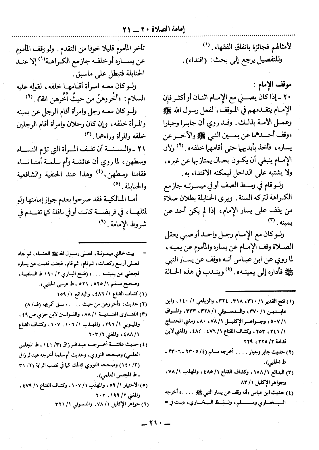 20 - إِذَا كَانَ يُصَلِّي مَعَ الإِْمَامِ اثْنَانِ أَوْ أَكْثَرُ فَإِنَّ الإِْمَامَ يَتَقَدَّمُهُمْ فِي الْمَوْقِفِ، لِفِعْل رَسُول اللَّهِ صَلَّى اللَّهُ عَلَيْهِ وَسَلَّمَ وَعَمَل الأُْمَّةِ بِذَلِكَ. وَقَدْ رُوِيَ أَنَّ جَابِرًا وَجَبَّارًا وَقَفَ أَحَدُهُمَا عَنْ يَمِينِ النَّبِيِّ صَلَّى اللَّهُ عَلَيْهِ وَسَلَّمَ وَالآْخَرُ عَنْ يَسَارِهِ، فَأَخَذَ بِأَيْدِيهِمَا حَتَّى أَقَامَهُمَا خَلْفَهُ. (2) وَلأَِنَّ الإِْمَامَ يَنْبَغِي أَنْ يَكُونَ بِحَالٍ يَمْتَازُ بِهَا عَنْ غَيْرِهِ، وَلاَ يَشْتَبِهُ عَلَى الدَّاخِل لِيُمْكِنَهُ الاِقْتِدَاءُ بِهِ.