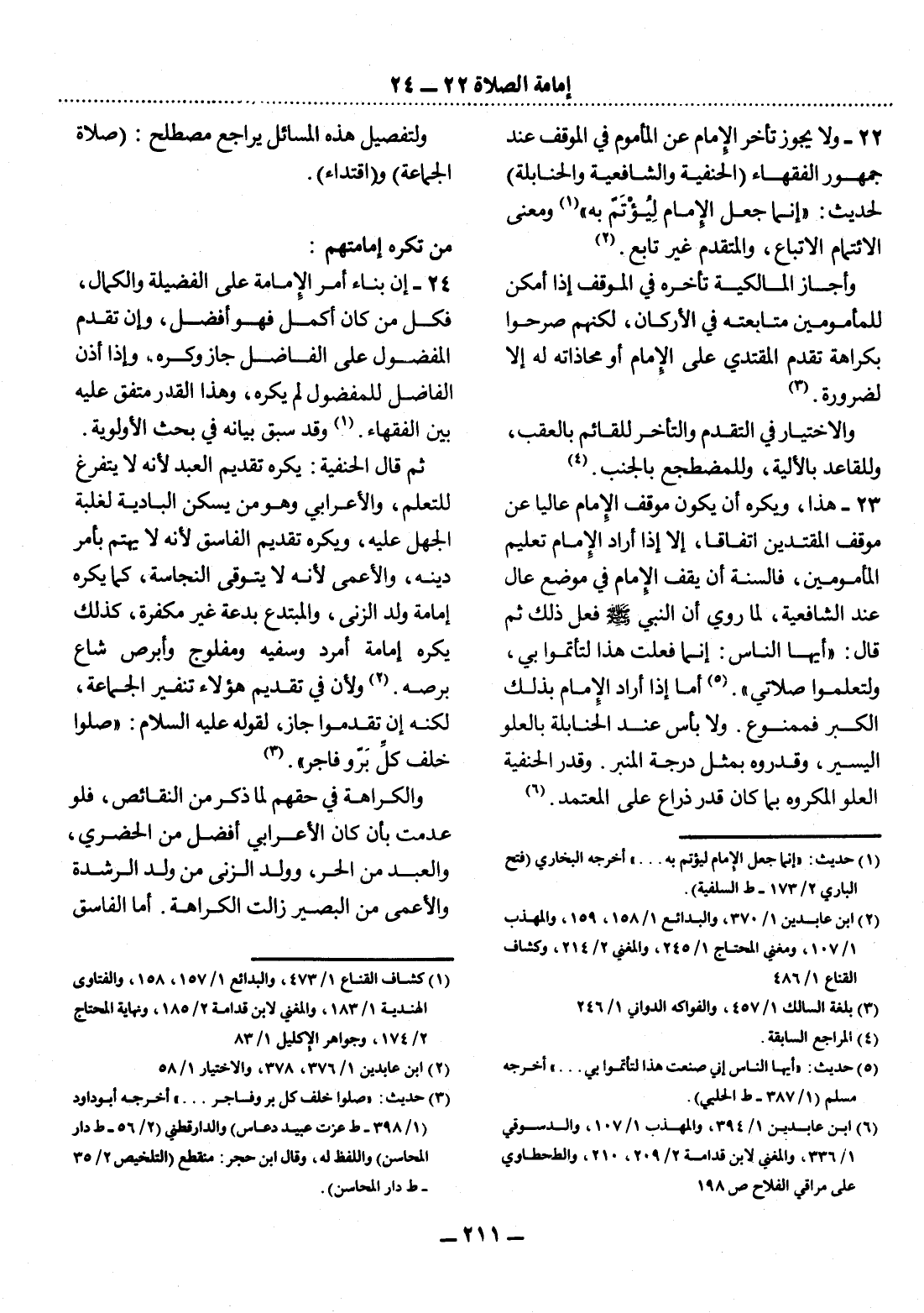 24 - إِنَّ بِنَاءَ أَمْرِ الإِْمَامَةِ عَلَى الْفَضِيلَةِ وَالْكَمَال، فَكُل مَنْ كَانَ أَكْمَل فَهُوَ أَفْضَل، وَإِنْ تَقَدَّمَ الْمَفْضُول عَلَى الْفَاضِل جَازَ وَكُرِهَ وَإِذَا أَذِنَ الْفَاضِل لِلْمَفْضُول لَمْ يُكْرَهْ، وَهَذَا الْقَدْرُ مُتَّفَقٌ عَلَيْهِ بَيْنَ الْفُقَهَاءِ. (1) وَقَدْ سَبَقَ بَيَانُهُ فِي بَحْثِ الأَْوْلَوِيَّةِ.