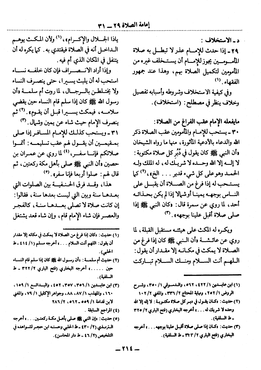 29 - إِذَا حَدَثَ لِلإِْمَامِ عُذْرٌ لاَ تَبْطُل بِهِ صَلاَةُ الْمَأْمُومِينَ يَجُوزُ لِلإِْمَامِ أَنْ يَسْتَخْلِفَ غَيْرَهُ مِنَ الْمَأْمُومِينَ لِتَكْمِيل الصَّلاَةِ بِهِمْ، وَهَذَا عِنْدَ جُمْهُورِ الْفُقَهَاءِ. (1)