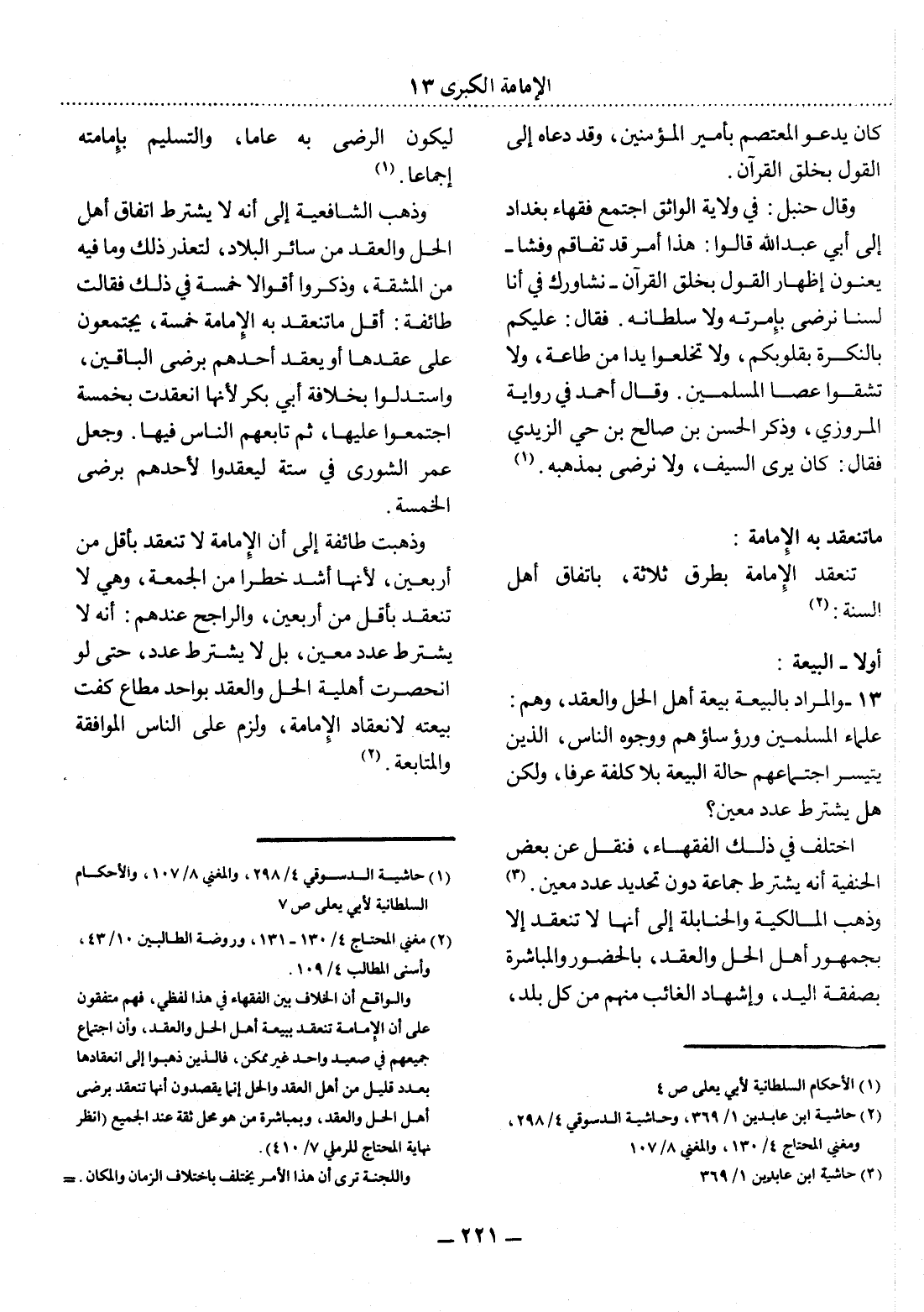 (2) مغني المحتاج 4 / 130 - 131، وروضة الطالبين 10 / 43، وأسنى المطالب 4 / 109. والواقع أن الخلاف بين الفقهاء في هذا لفظي، فهم متفقون على أن الإمامة تنعقد ببيعة أهل الحل والعقد، وأن اجتماع جميعهم في صعيد واحد غير ممكن، فالذين ذهبوا إلى انعقادها بعدد قليل من أهل العقد والحل إنما يقصدون أنها تنعقد برضى أهل الحل والعقد، وبمباشرة من