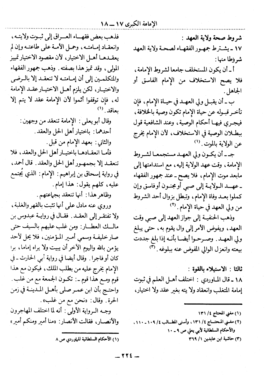 (2) مغني المحتاج 4 / 131، وأسنى المطالب 4 / 109 - 110، والأحكام السلطانية لأبي يعلى ص 9 - 10