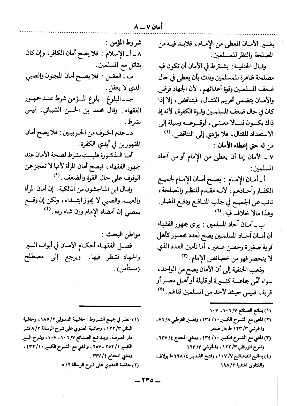 (1) انظر في جميع الشروط: حاشية الدسوقي 2 / 185، وحاشية البناني 3 / 122، وحاشية العدوي على شرح الرسالة 2 / 8 نشر دار المعرفة، وبدائع الصنائع 7 / 106، 107، وشرح السير الكبير 1 / 252 - 257، والمغني مع الشرح الكبير 10 / 432، ومغني المحتاج 4 / 237