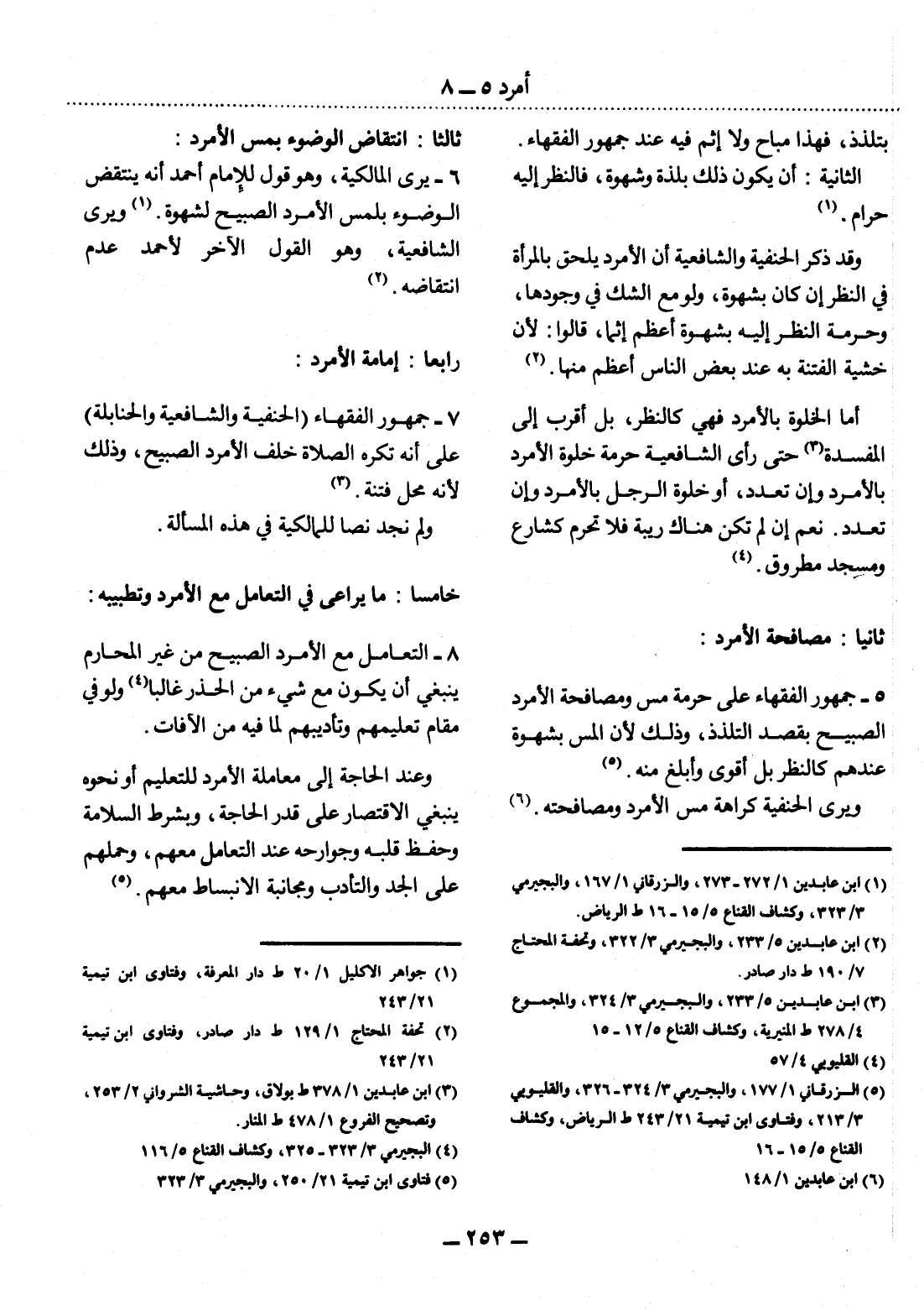 5 - جُمْهُورُ الْفُقَهَاءِ عَلَى حُرْمَةِ مَسِّ وَمُصَافَحَةِ الأَْمْرَدِ الصَّبِيحِ بِقَصْدِ التَّلَذُّذِ، وَذَلِكَ لأَِنَّ الْمَسَّ بِشَهْوَةٍ عِنْدَهُمْ كَالنَّظَرِ بَل أَقْوَى وَأَبْلَغُ مِنْهُ. (5)