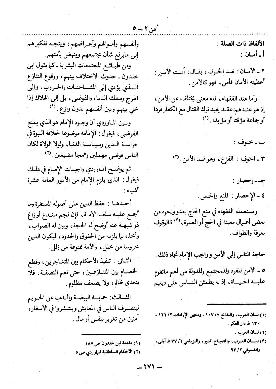 5 - الأَْمْنُ لِلْفَرْدِ وَلِلْمُجْتَمَعِ وَلِلدَّوْلَةِ مِنْ أَهَمِّ مَا تَقُومُ عَلَيْهِ الْحَيَاةُ، إِذْ بِهِ يَطْمَئِنُّ النَّاسُ عَلَى دِينِهِمْ