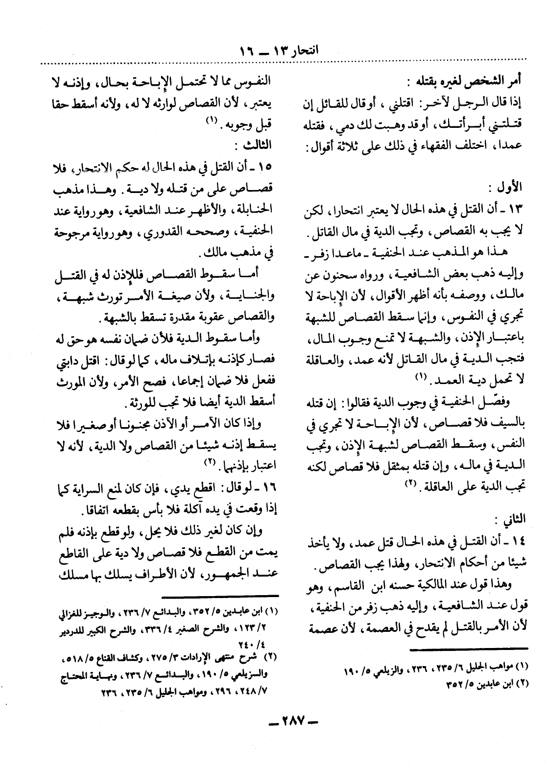 13 - أَنَّ الْقَتْل فِي هَذِهِ الْحَال لاَ يُعْتَبَرُ انْتِحَارًا، لَكِنْ لاَ يَجِبُ بِهِ الْقِصَاصُ، وَتَجِبُ الدِّيَةُ فِي مَال الْقَاتِل.