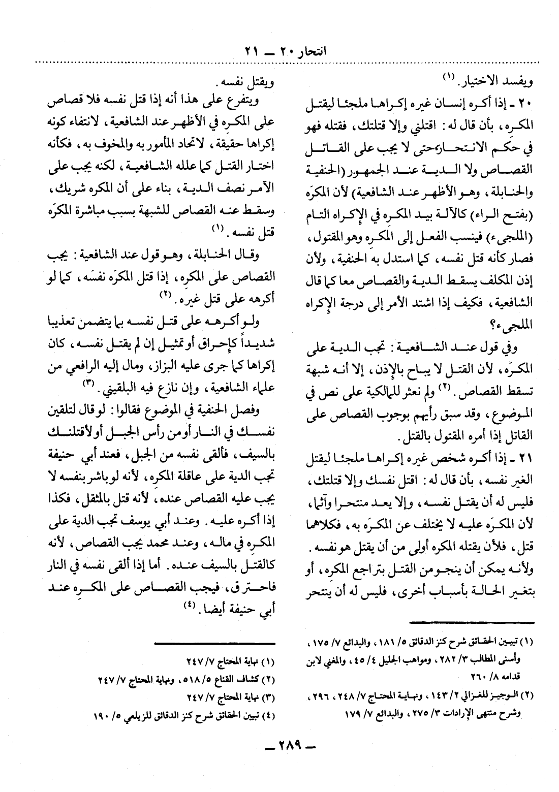 21 - إِذَا أَكْرَهَ شَخْصٌ غَيْرَهُ إِكْرَاهًا مُلْجِئًا لِيَقْتُل الْغَيْرُ نَفْسَهُ، بِأَنْ قَال لَهُ: اقْتُل نَفْسَكَ وَإِلاَّ قَتَلْتُكَ، فَلَيْسَ لَهُ أَنْ يَقْتُل نَفْسَهُ، وَإِلاَّ يُعَدُّ مُنْتَحِرًا وَآثِمًا؛ لأَِنَّ الْمُكْرَهَ عَلَيْهِ لاَ يَخْتَلِفُ عَنِ الْمُكْرَهِ بِهِ، فَكِلاَهُمَا قَتْلٌ، فَلأََنْ يَقْتُلَهُ الْمُكْرِهُ أَوْلَى مِنْ أَنْ يَقْتُل هُوَ نَفْسَهُ. وَلأَِنَّهُ يُمْكِنُ أَنْ يَنْجُوَ مِنَ الْقَتْل بِتَرَاجُعِ الْمُكْرِهِ، أَوْ بِتَغَيُّرِ الْحَالَةِ بِأَسْبَابٍ أُخْرَى، فَلَيْسَ لَهُ أَنْ يَنْتَحِرَ