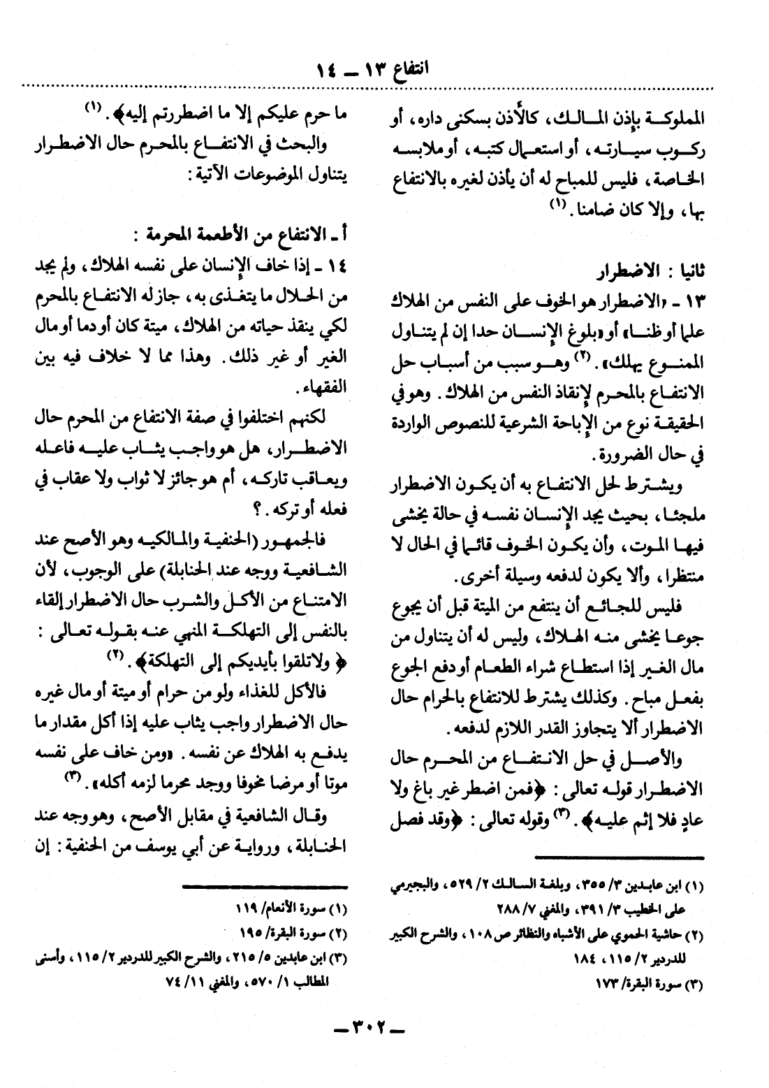 13 - " الاِضْطِرَارُ هُوَ الْخَوْفُ عَلَى النَّفْسِ مِنَ الْهَلاَكِ عِلْمًا أَوْ ظَنًّا " أَوْ " بُلُوغُ الإِْنْسَانِ حَدًّا إِنْ لَمْ يَتَنَاوَل الْمَمْنُوعَ يَهْلِكُ (2) " وَهُوَ سَبَبٌ مِنْ أَسْبَابِ حِل الاِنْتِفَاعِ بِالْمُحَرَّمِ لإِِنْقَاذِ النَّفْسِ مِنَ الْهَلاَكِ. وَهُوَ فِي الْحَقِيقَةِ نَوْعٌ مِنَ الإِْبَاحَةِ الشَّرْعِيَّةِ لِلنُّصُوصِ الْوَارِدَةِ فِي حَال الضَّرُورَةِ.