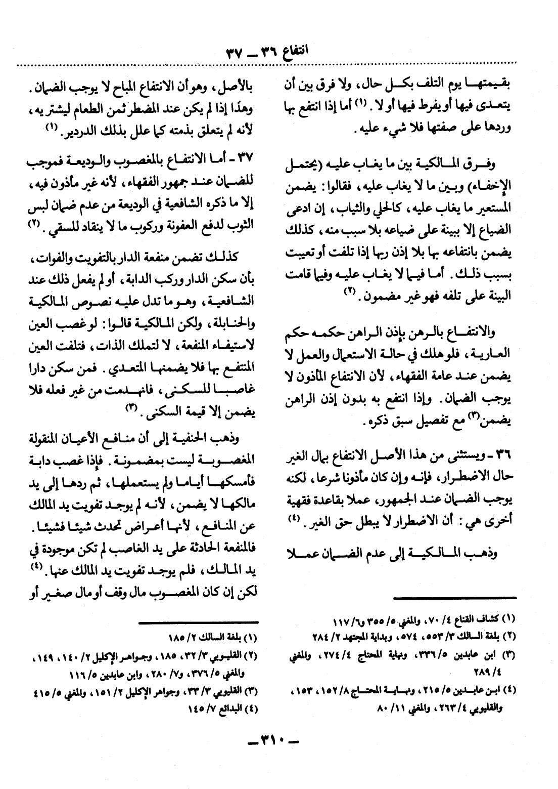 37 - أَمَّا الاِنْتِفَاعُ بِالْمَغْصُوبِ وَالْوَدِيعَةِ فَمُوجِبٌ لِلضَّمَانِ عِنْدَ جُمْهُورِ الْفُقَهَاءِ، لأَِنَّهُ غَيْرُ مَأْذُونٍ فِيهِ، إِلاَّ مَا ذَكَرَ الشَّافِعِيَّةُ فِي الْوَدِيعَةِ مِنْ عَدَمِ ضَمَانِ لُبْسِ الثَّوْبِ لِدَفْعِ الْعُفُونَةِ وَرُكُوبِ مَا لاَ يَنْقَادُ لِلسَّقْيِ. (2)