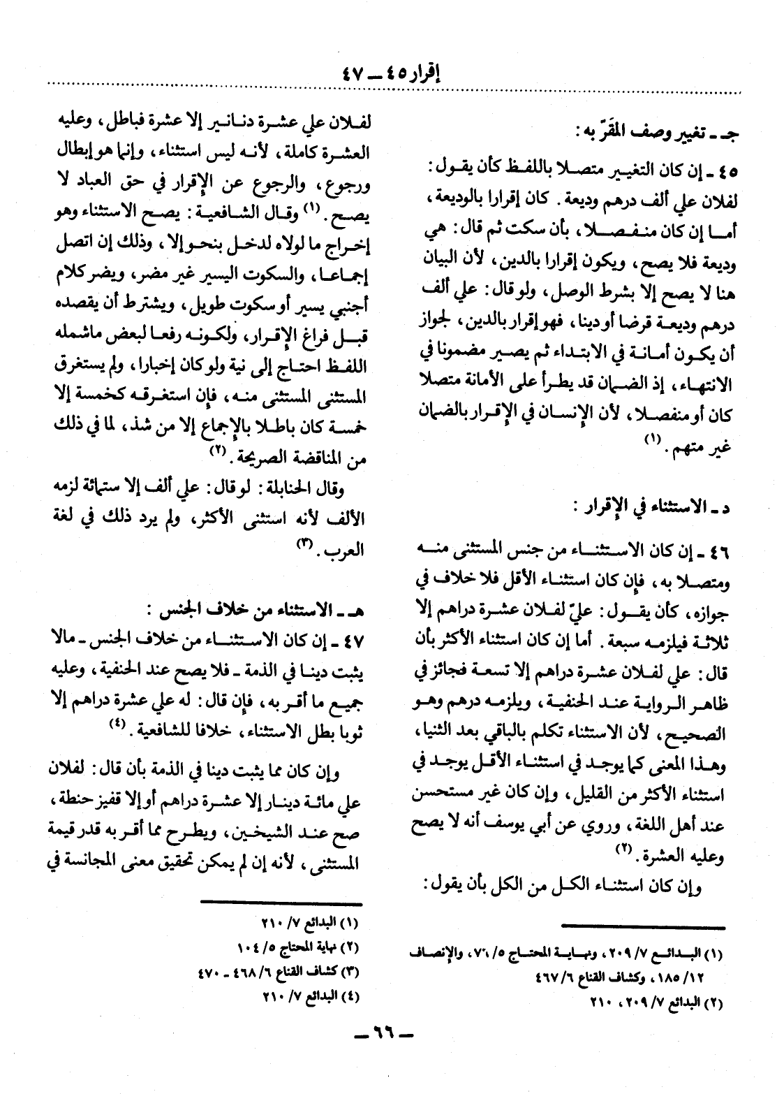 47 - إِنْ كَانَ الاِسْتِثْنَاءُ مِنْ خِلاَفِ الْجِنْسِ - مَا لاَ يَثْبُتُ دَيْنًا فِي الذِّمَّةِ - فَلاَ يَصِحُّ عِنْدَ الْحَنَفِيَّةِ، وَعَلَيْهِ جَمِيعُ مَا أَقَرَّ بِهِ، فَإِنْ قَال: لَهُ عَلَيَّ عَشَرَةُ دَرَاهِمَ إِلاَّ ثَوْبًا بَطَل الاِسْتِثْنَاءُ، خِلاَفًا لِلشَّافِعِيَّةِ. (4)
