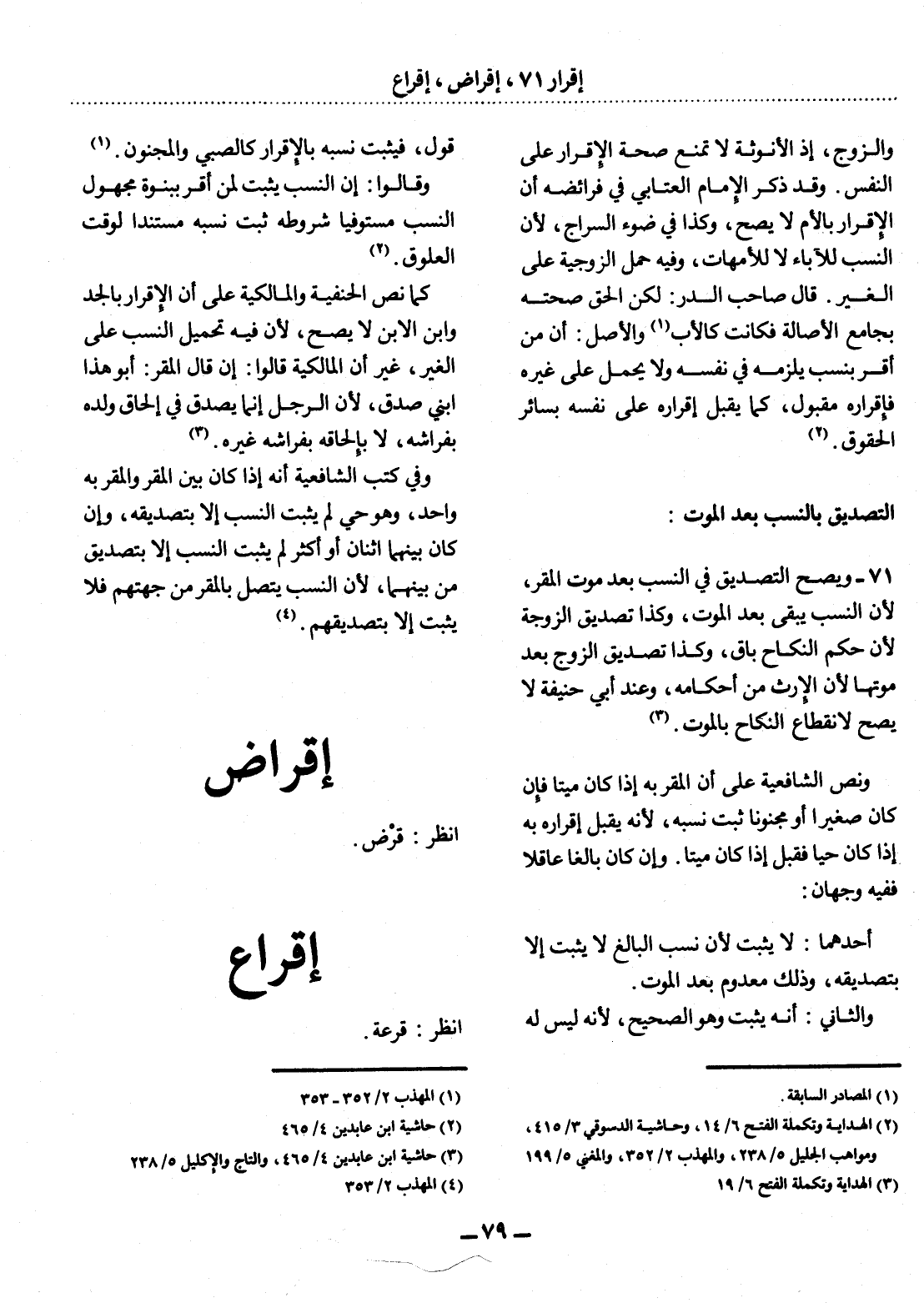 71 - وَيَصِحُّ التَّصْدِيقُ فِي النَّسَبِ بَعْدَ مَوْتِ الْمُقِرِّ، لأَِنَّ النَّسَبَ يَبْقَى بَعْدَ الْمَوْتِ، وَكَذَا تَصْدِيقُ الزَّوْجَةِ لأَِنَّ حُكْمَ النِّكَاحِ بَاقٍ، وَكَذَا تَصْدِيقُ الزَّوْجِ بَعْدَ مَوْتِهَا لأَِنَّ الإِْرْثَ مِنْ أَحْكَامِهِ، وَعِنْدَ أَبِي حَنِيفَةَ لاَ يَصِحُّ لاِنْقِطَاعِ النِّكَاحِ بِالْمَوْتِ. (3)
