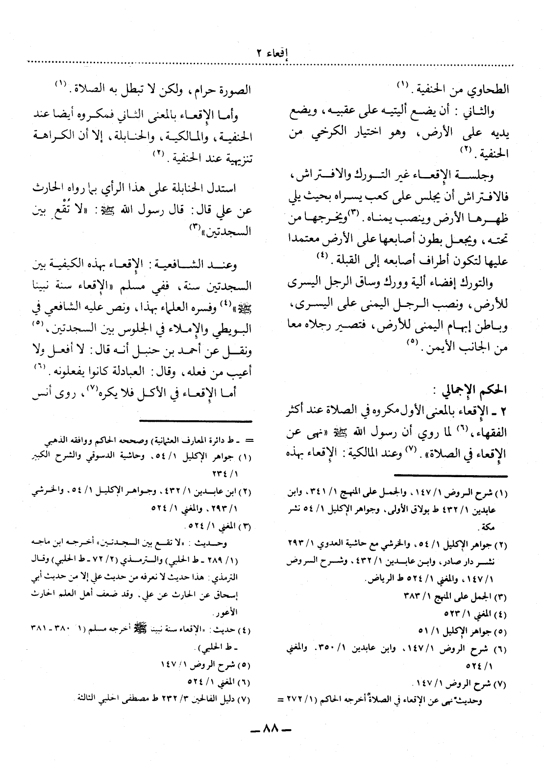 (7) شرح الروض 1 / 147. وحديث " نهى عن الإقعاء في الصلاة " أخرجه الحاكم (1 / 272 - ط دائرة المعارف العثمانية) وصححه الحاكم ووافقه الذهبي.