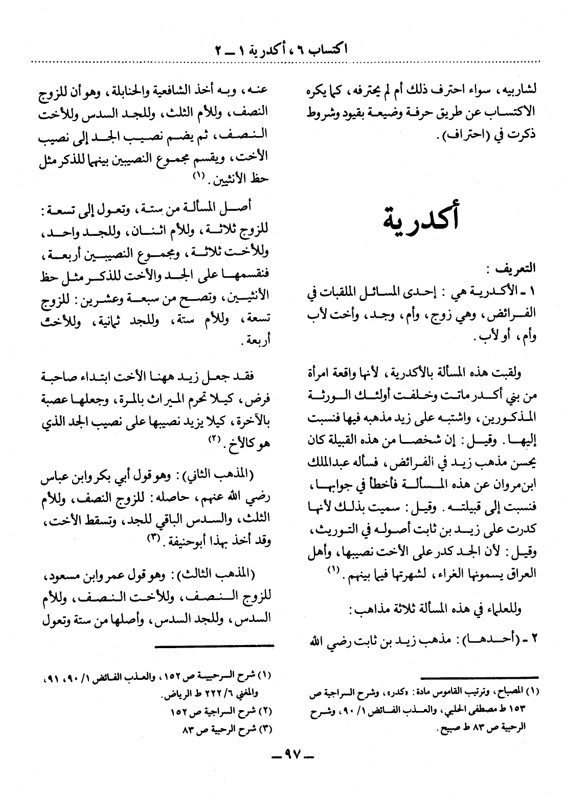 (1) المصباح، وترتيب القاموس مادة: " كدر "، وشرح السراجية ص 153 ط مصطفى الحلبي، والعذب الفائض 1 / 90، وشرح الرحبية ص 83 ط صبيح.
