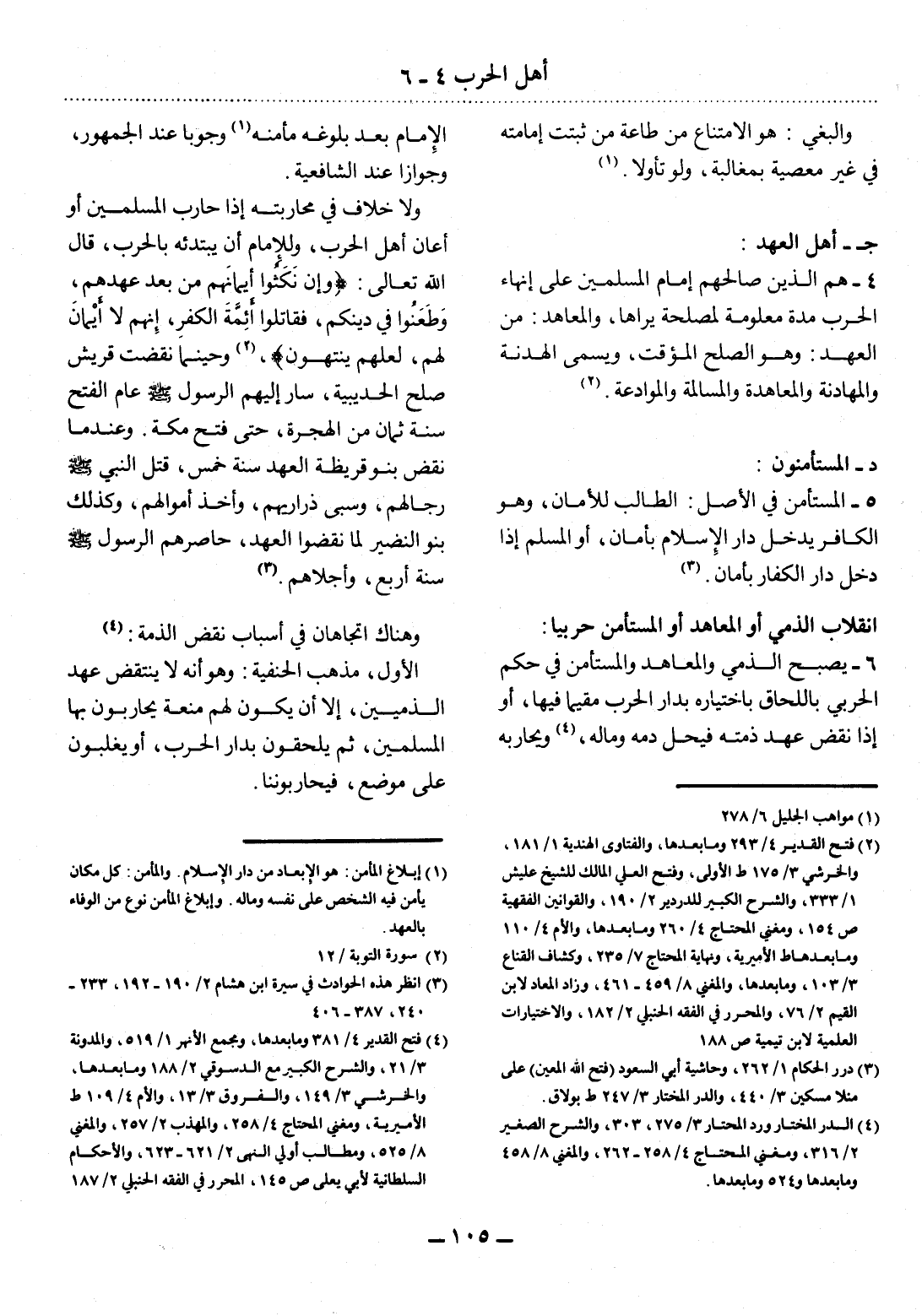 6 - يُصْبِحُ الذِّمِّيُّ وَالْمُعَاهَدُ وَالْمُسْتَأْمَنُ فِي حُكْمِ الْحَرْبِيِّ بِاللَّحَاقِ بِاخْتِيَارِهِ بِدَارِ الْحَرْبِ مُقِيمًا فِيهَا، أَوْ إِذَا نَقَضَ عَهْدَ ذِمَّتِهِ فَيَحِل دَمُهُ وَمَالُهُ (4) ، وَيُحَارِبُهُ