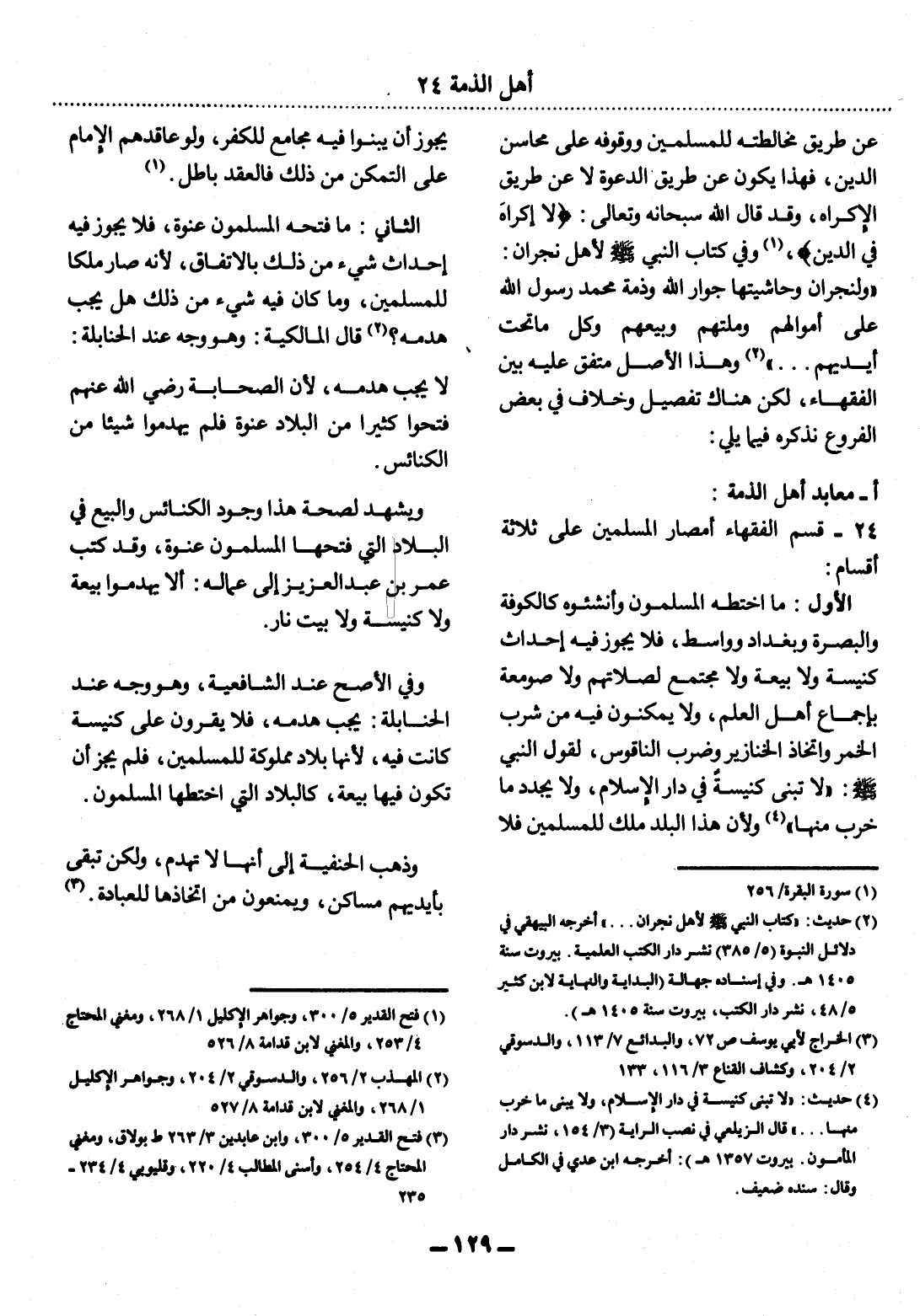 (4) حديث: " لا تبنى كنيسة في دار الإسلام، ولا يبنى ما خرب منها. . . . " قال الزيلعي في نصب الراية (3 / 154، نشر دار المأمون. بيروت 1357 هـ) : أخرجه ابن عدي في الكامل وقال: سنده ضعيف.