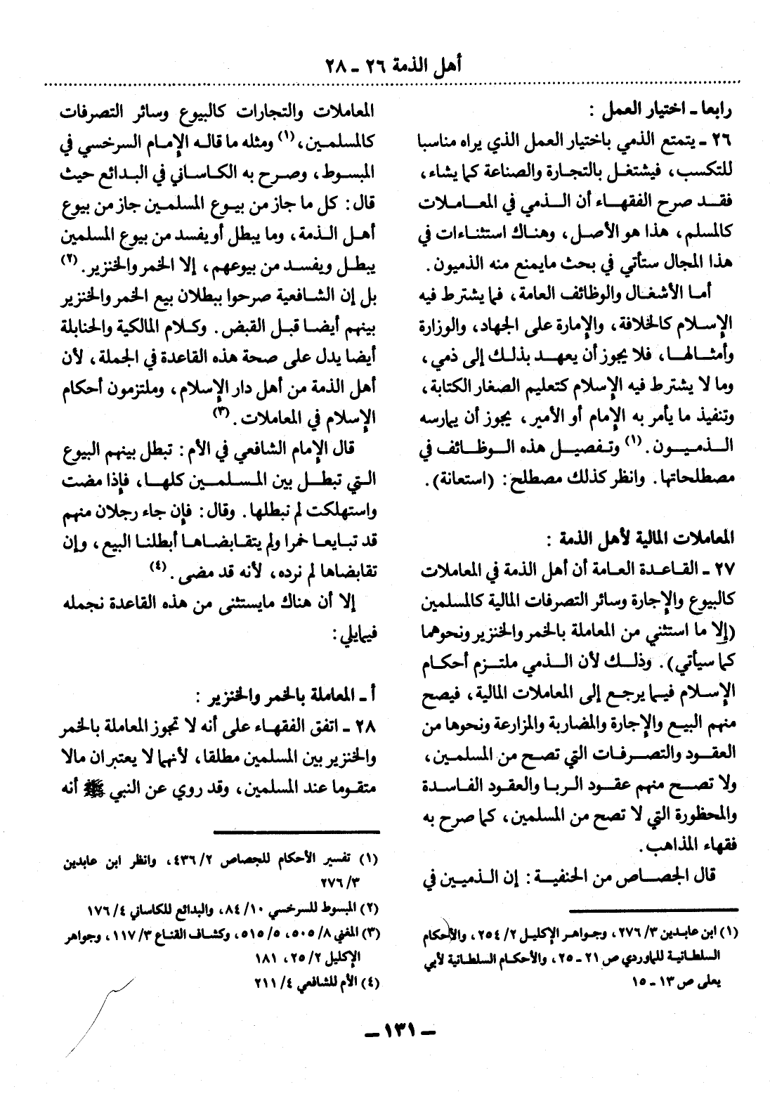 27 - الْقَاعِدَةُ الْعَامَّةُ أَنَّ أَهْل الذِّمَّةِ فِي الْمُعَامَلاَتِ كَالْبُيُوعِ وَالإِْجَارَةِ وَسَائِرِ التَّصَرُّفَاتِ الْمَالِيَّةِ كَالْمُسْلِمِينَ (إِلاَّ مَا اسْتُثْنِيَ مِنَ الْمُعَامَلَةِ بِالْخَمْرِ وَالْخِنْزِيرِ وَنَحْوِهِمَا كَمَا سَيَأْتِي) . وَذَلِكَ لأَِنَّ الذِّمِّيَّ مُلْتَزِمٌ أَحْكَامَ الإِْسْلاَمِ فِيمَا يَرْجِعُ إِلَى الْمُعَامَلاَتِ الْمَالِيَّةِ، فَيَصِحُّ مِنْهُمُ الْبَيْعُ وَالإِْجَارَةُ وَالْمُضَارَبَةُ وَالْمُزَارَعَةُ وَنَحْوُهَا مِنَ الْعُقُودِ وَالتَّصَرُّفَاتِ الَّتِي تَصِحُّ مِنَ الْمُسْلِمِينَ، وَلاَ تَصِحُّ مِنْهُمْ عُقُودُ الرِّبَا وَالْعُقُودُ الْفَاسِدَةُ وَالْمَحْظُورَةُ الَّتِي لاَ تَصِحُّ مِنَ الْمُسْلِمِينَ، كَمَا صَرَّحَ بِهِ فُقَهَاءُ الْمَذَاهِبِ.