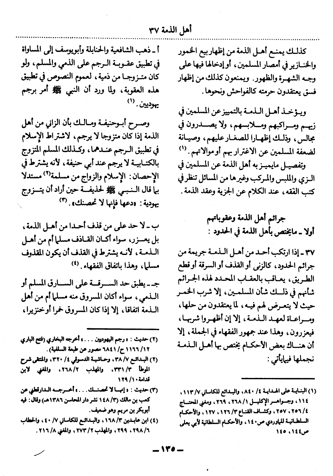 37 - إِذَا ارْتَكَبَ أَحَدٌ مِنْ أَهْل الذِّمَّةِ جَرِيمَةً مِنْ جَرَائِمِ الْحُدُودِ، كَالزِّنَى أَوِ الْقَذْفِ أَوِ السَّرِقَةِ أَوْ قَطْعِ الطَّرِيقِ، يُعَاقَبُ بِالْعِقَابِ الْمُحَدَّدِ لِهَذِهِ الْجَرَائِمِ شَأْنُهُمْ فِي ذَلِكَ شَأْنُ الْمُسْلِمِينَ، إِلاَّ شُرْبَ الْخَمْرِ حَيْثُ لاَ يُتَعَرَّضُ لَهُمْ فِيهِ؛ لِمَا يَعْتَقِدُونَ مِنْ حِلِّهَا، وَمُرَاعَاةً لِعَهْدِ الذِّمَّةِ، إِلاَّ إِنْ أَظْهَرُوا شُرْبَهَا، فَيُعَزَّرُونَ، وَهَذَا عِنْدَ جُمْهُورِ الْفُقَهَاءِ فِي الْجُمْلَةِ، إِلاَّ أَنَّ هُنَاكَ بَعْضَ الأَْحْكَامِ يَخْتَصُّ بِهَا أَهْل الذِّمَّةِ نُجْمِلُهَا فِيمَا يَأْتِي: