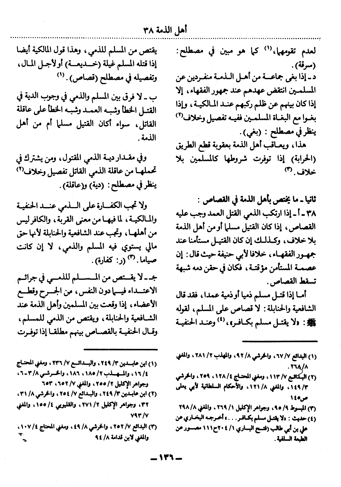38 - أ - إِذَا ارْتَكَبَ الذِّمِّيُّ الْقَتْل الْعَمْدَ وَجَبَ عَلَيْهِ الْقِصَاصُ، إِذَا كَانَ الْقَتِيل مُسْلِمًا أَوْ مِنْ أَهْل الذِّمَّةِ بِلاَ خِلاَفٍ، وَكَذَلِكَ إِنْ كَانَ الْقَتِيل مُسْتَأْمَنًا عِنْدَ جُمْهُورِ الْفُقَهَاءِ، خِلاَفًا لأَِبِي حَنِيفَةَ حَيْثُ قَال: إِنَّ عِصْمَةَ الْمُسْتَأْمَنِ مُؤَقَّتَةٌ، فَكَانَ فِي حَقْنِ دَمِهِ شُبْهَةٌ تُسْقِطُ الْقِصَاصَ.