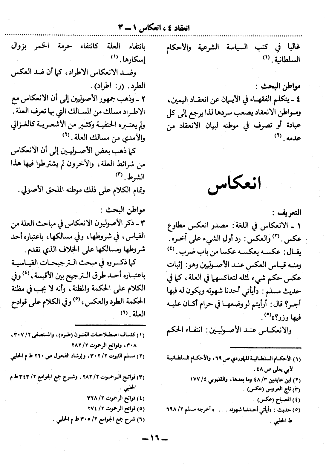 3 - ذَكَرَ الأُْصُولِيُّونَ الاِنْعِكَاسَ فِي مَبَاحِثِ الْعِلَّةِ مِنَ الْقِيَاسِ، فِي شُرُوطِهَا، وَفِي مَسَالِكِهَا، بِاعْتِبَارِهِ أَحَدَ شُرُوطِهَا وَمَسَالِكِهَا عَلَى الْخِلاَفِ الَّذِي تَقَدَّمَ كَمَا ذَكَرُوهُ فِي مَبْحَثِ التَّرْجِيحَاتِ الْقِيَاسِيَّةِ بِاعْتِبَارِهِ أَحَدَ طُرُقِ التَّرْجِيحِ بَيْنَ الأَْقْيِسَةِ، (4) وَفِي الْكَلاَمِ عَلَى الْحِكْمَةِ وَالْمَظِنَّةِ، وَأَنَّهُ لاَ يَجِبُ فِي مَظِنَّةِ الْحِكْمَةِ الطَّرْدُ وَالْعَكْسُ، (5) وَفِي الْكَلاَمِ عَلَى قَوَادِحِ الْعِلَّةِ. (6)