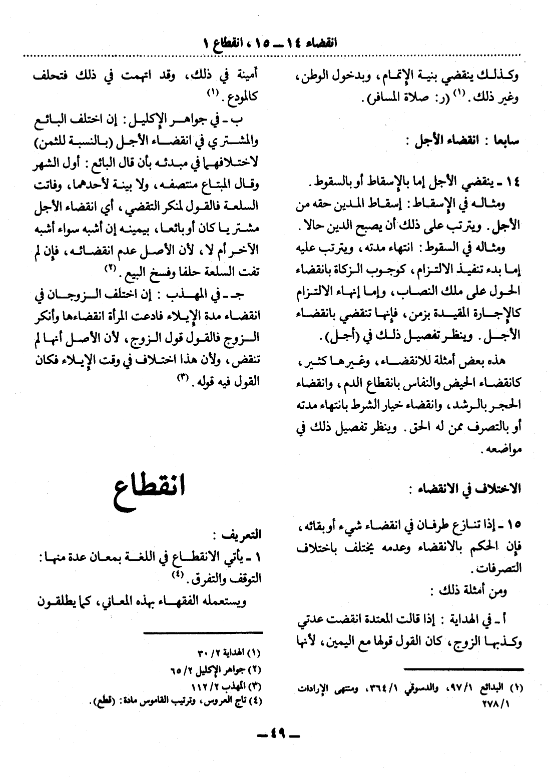 14 - يَنْقَضِي الأَْجَل إِمَّا بِالإِْسْقَاطِ أَوْ بِالسُّقُوطِ. وَمِثَالُهُ فِي الإِْسْقَاطِ: إِسْقَاطُ الْمَدِينِ حَقَّهُ مِنَ الأَْجَل. وَيَتَرَتَّبُ عَلَى ذَلِكَ أَنْ يُصْبِحَ الدَّيْنُ حَالًّا. وَمِثَالُهُ فِي السُّقُوطِ: انْتِهَاءُ مُدَّتِهِ، وَيَتَرَتَّبُ عَلَيْهِ إِمَّا بَدْءُ تَنْفِيذِ الاِلْتِزَامِ، كَوُجُوبِ الزَّكَاةِ بِانْقِضَاءِ الْحَوْل عَلَى مِلْكِ النِّصَابِ، وَإِمَّا إِنْهَاءُ الاِلْتِزَامِ كَالإِْجَارَةِ الْمُقَيَّدَةِ بِزَمَنٍ، فَإِنَّهَا تَنْقَضِي بِانْقِضَاءِ الأَْجَل. وَيُنْظَرُ تَفْصِيل ذَلِكَ فِي (أَجَلٍ) .