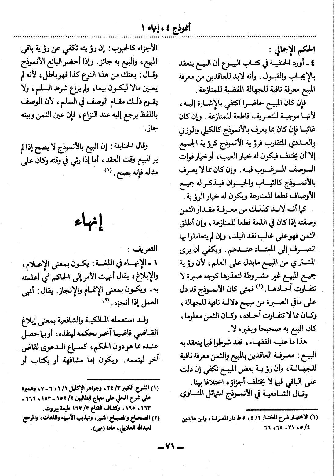 4 - أَوْرَدَ الْحَنَفِيَّةُ فِي كِتَابِ الْبُيُوعِ أَنَّ الْبَيْعَ يَنْعَقِدُ بِالإِْيجَابِ وَالْقَبُول. وَأَنَّهُ لاَ بُدَّ لِلْعَاقِدَيْنِ مِنْ مَعْرِفَةِ الْمَبِيعِ مَعْرِفَةً نَافِيَةً لِلْجَهَالَةِ الْمُفْضِيَةِ لِلْمُنَازَعَةِ. فَإِنْ كَانَ الْمَبِيعُ حَاضِرًا اكْتُفِيَ بِالإِْشَارَةِ إِلَيْهِ؛ لأَِنَّهَا مُوجِبَةٌ لِلتَّعْرِيفِ قَاطِعَةٌ لِلْمُنَازَعَةِ. وَإِنْ كَانَ غَائِبًا فَإِنْ كَانَ مِمَّا يُعْرَفُ بِالأُْنْمُوذَجِ كَالْكَيْلِيِّ وَالْوَزْنِيِّ وَالْعَدَدِيِّ الْمُتَقَارِبِ فَرُؤْيَةُ الأُْنْمُوذَجِ كَرُؤْيَةِ الْجَمِيعِ إِلاَّ أَنْ يَخْتَلِفَ فَيَكُونَ لَهُ خِيَارُ الْعَيْبِ، أَوْ خِيَارُ فَوَاتِ الْوَصْفِ الْمَرْغُوبِ فِيهِ. وَإِنْ كَانَ مِمَّا لاَ يُعْرَفُ بِالأُْنْمُوذَجِ كَالثِّيَابِ وَالْحَيَوَانِ فَيَذْكُرُ لَهُ جَمِيعَ الأَْوْصَافِ قَطْعًا لِلْمُنَازَعَةِ وَيَكُونُ لَهُ خِيَارُ الرُّؤْيَةِ.