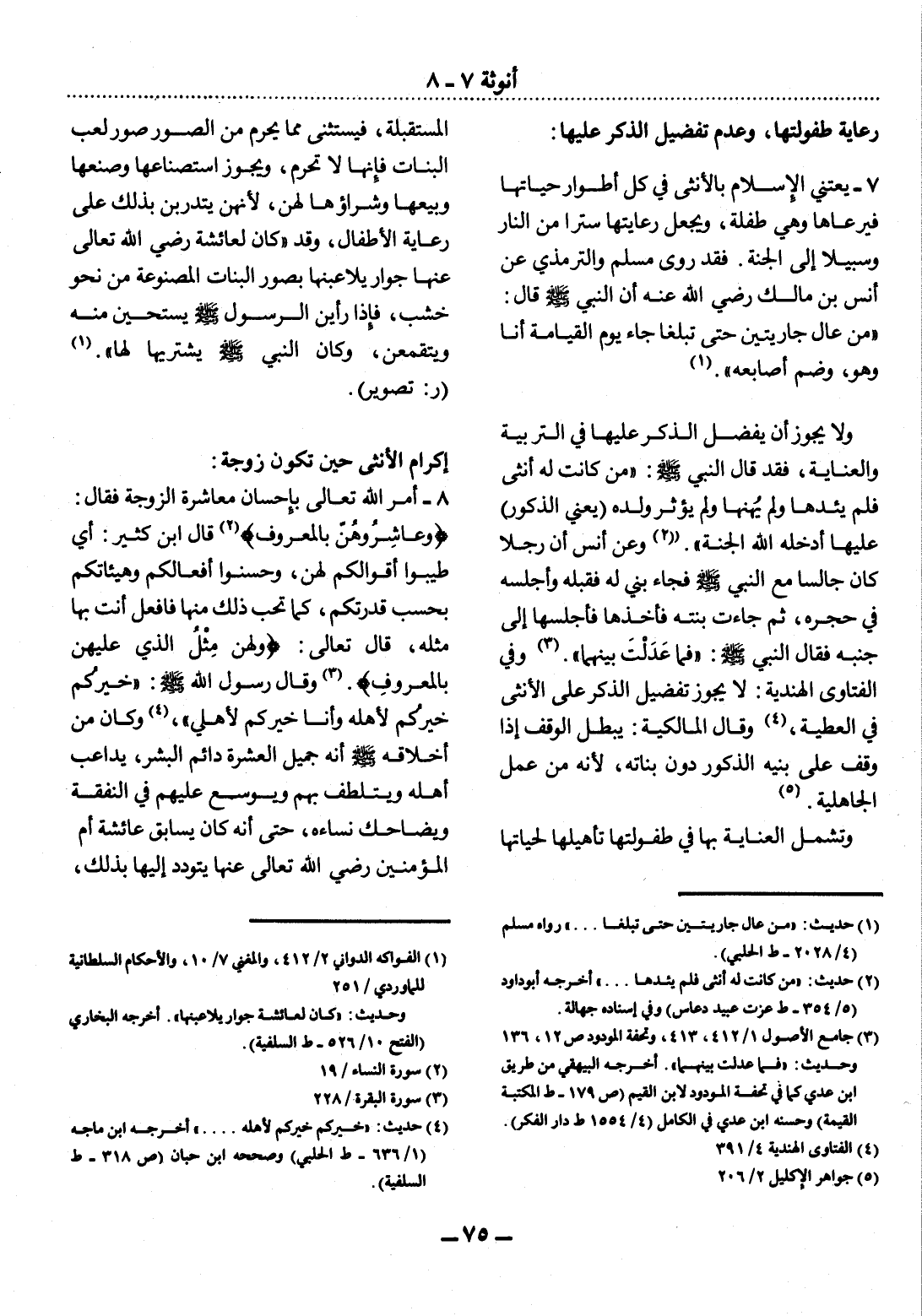 7 - يَعْتَنِي الإِْسْلاَمُ بِالأُْنْثَى فِي كُل أَطْوَارِ حَيَاتِهَا فَيَرْعَاهَا وَهِيَ طِفْلَةٌ، وَيَجْعَل رِعَايَتَهَا سِتْرًا مِنَ النَّارِ وَسَبِيلاً إِلَى الْجَنَّةِ. فَقَدْ رَوَى مُسْلِمٌ وَالتِّرْمِذِيُّ عَنْ أَنَسِ بْنِ مَالِكٍ رَضِيَ اللَّهُ عَنْهُ أَنَّ النَّبِيَّ صَلَّى اللَّهُ عَلَيْهِ وَسَلَّمَ قَال: مَنْ عَال جَارَتَيْنِ حَتَّى تَبْلُغَا جَاءَ يَوْمَ الْقِيَامَةِ أَنَا وَهُوَ، وَضَمَّ أَصَابِعَهُ (1) .