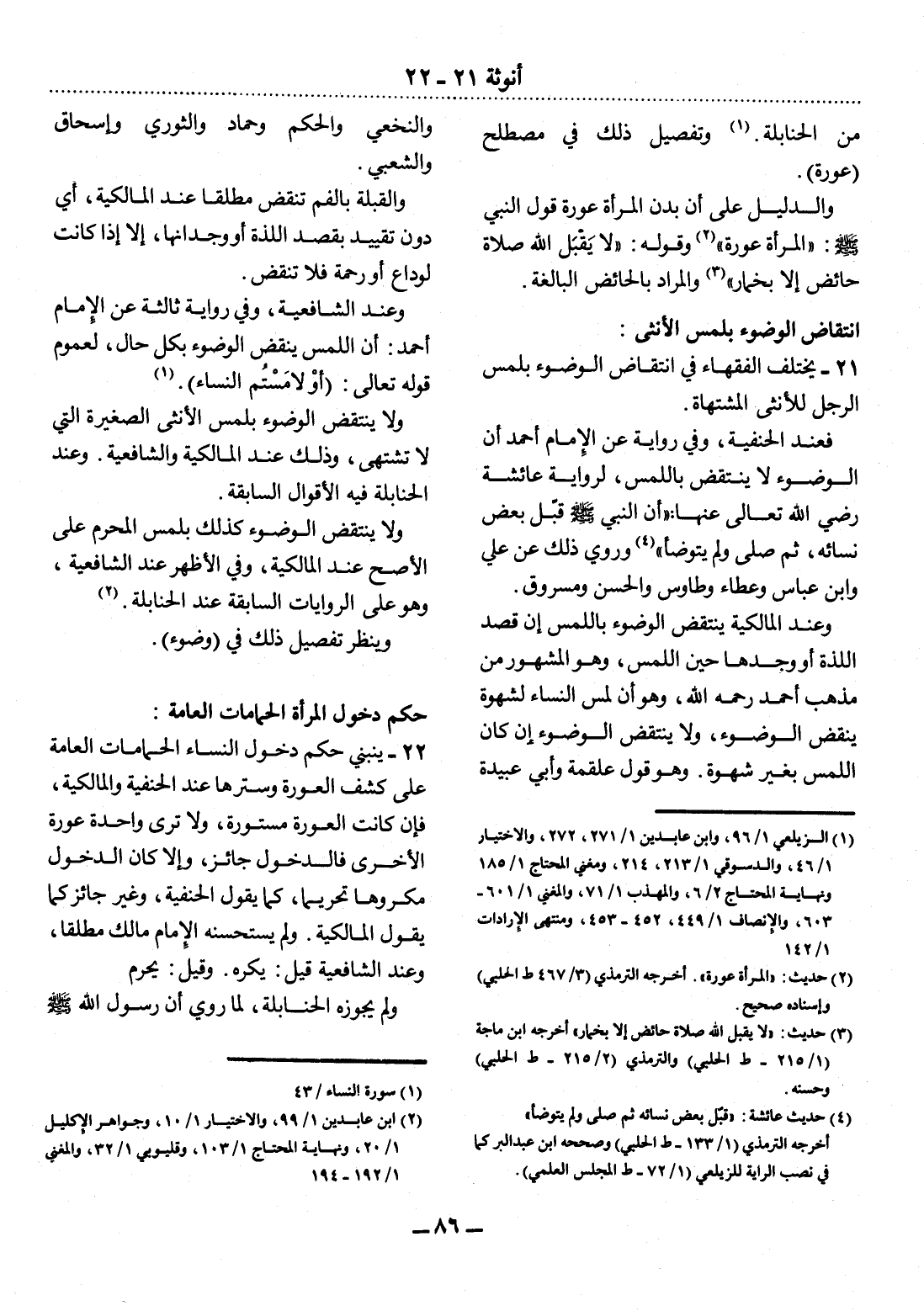 21 - يَخْتَلِفُ الْفُقَهَاءُ فِي انْتِقَاضِ الْوُضُوءِ بِلَمْسِ الرَّجُل لِلأُْنْثَى الْمُشْتَهَاةِ.