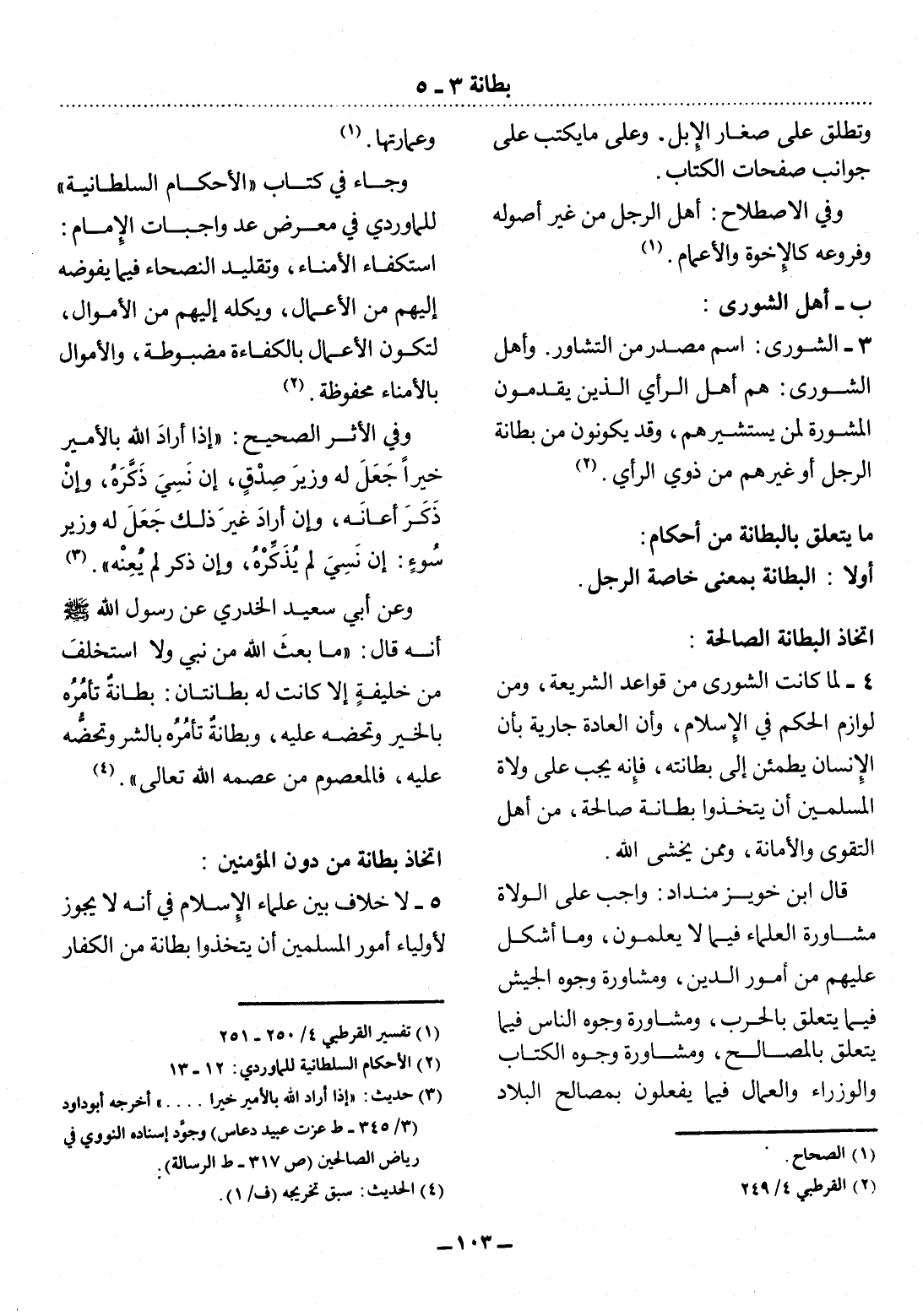4 - لَمَّا كَانَتِ الشُّورَى مِنْ قَوَاعِدِ الشَّرِيعَةِ، وَمِنْ لَوَازِمِ الْحُكْمِ فِي الإِْسْلاَمِ، وَإِنَّ الْعَادَةَ جَارِيَةٌ بِأَنَّ الإِْنْسَانَ يَطْمَئِنُّ إِلَى بِطَانَتِهِ، فَإِنَّهُ يَجِبُ عَلَى وُلاَةِ الْمُسْلِمِينَ أَنْ يَتَّخِذُوا بِطَانَةً صَالِحَةً، مِنْ أَهْل التَّقْوَى وَالأَْمَانَةِ، وَمِمَّنْ يَخْشَى اللَّهَ.
