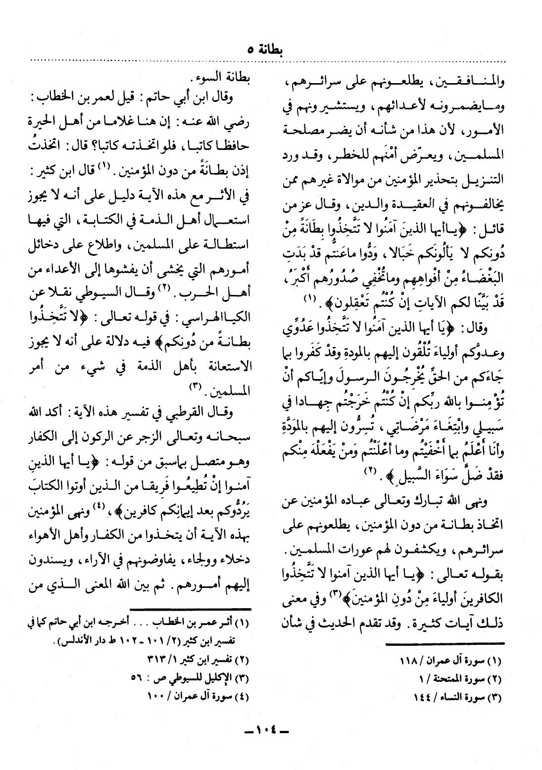 وَنَهَى اللَّهُ تَبَارَكَ وَتَعَالَى عِبَادَهُ الْمُؤْمِنِينَ عَنِ اتِّخَاذِ بِطَانَةٍ مِنْ دُونِ الْمُؤْمِنِينَ، يُطْلِعُونَهُمْ عَلَى سَرَائِرِهِمْ، وَيَكْشِفُونَ لَهُمْ عَوْرَاتِ الْمُسْلِمِينَ. بِقَوْلِهِ تَعَالَى: {يَا أَيُّهَا الَّذِينَ آمَنُوا لاَ تَتَّخِذُوا الْكَافِرِينَ أَوْلِيَاءَ مِنْ دُونِ الْمُؤْمِنِينَ} . (3) وَفِي مَعْنَى ذَلِكَ آيَاتٌ كَثِيرَةٌ. وَقَدْ تَقَدَّمَ الْحَدِيثُ فِي شَأْنِ