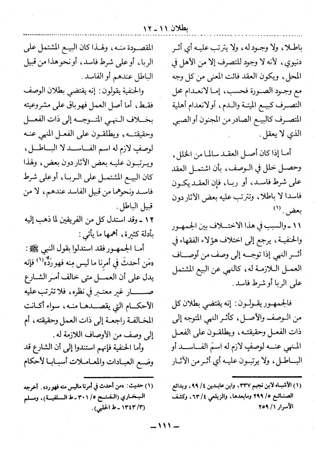 11 - وَالسَّبَبُ فِي هَذَا الاِخْتِلاَفِ بَيْنَ الْجُمْهُورِ وَالْحَنَفِيَّةِ، يَرْجِعُ إِلَى اخْتِلاَفِ هَؤُلاَءِ الْفُقَهَاءِ فِي أَثَرِ النَّهْيِ إِذَا تَوَجَّهَ إِلَى وَصْفٍ مِنْ أَوْصَافِ الْعَمَل اللاَّزِمَةِ لَهُ، كَالنَّهْيِ عَنِ الْبَيْعِ الْمُشْتَمِل عَلَى الرِّبَا أَوْ شَرْطٍ فَاسِدٍ. فَالْجُمْهُورُ يَقُولُونَ: إِنَّهُ يَقْتَضِي بُطْلاَنَ كُلٍّ مِنَ الْوَصْفِ وَالأَْصْل، كَأَثَرِ النَّهْيِ الْمُتَوَجِّهِ إِلَى ذَاتِ الْفِعْل وَحَقِيقَتِهِ، وَيُطْلِقُونَ عَلَى الْفِعْل الْمَنْهِيِّ عَنْهُ لِوَصْفٍ لاَزِمٍ لَهُ اسْمَ الْفَاسِدِ أَوِ الْبَاطِل، وَلاَ يُرَتِّبُونَ عَلَيْهِ أَيَّ أَثَرٍ مِنَ الآْثَارِ