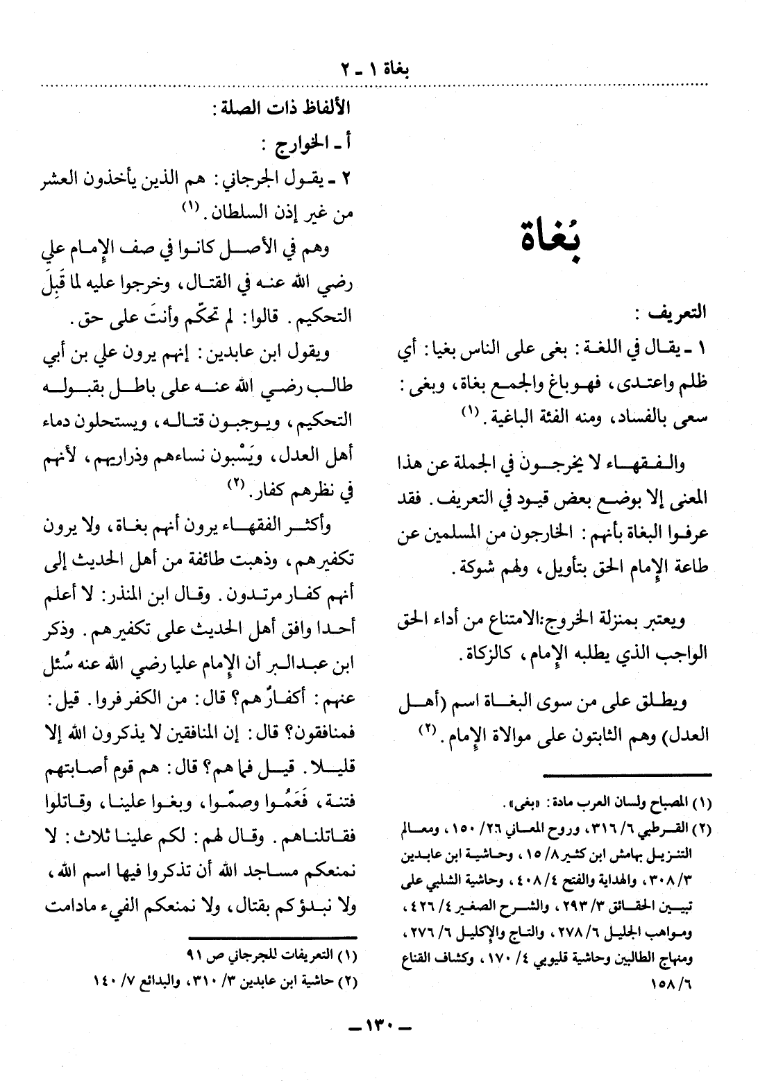 وَالْفُقَهَاءُ لاَ يَخْرُجُونَ فِي الْجُمْلَةِ عَنْ هَذَا الْمَعْنَى إِلاَّ بِوَضْعِ بَعْضِ قُيُودٍ فِي التَّعْرِيفِ فَقَدْ عَرَّفُوا الْبُغَاةَ بِأَنَّهُمُ: الْخَارِجُونَ مِنَ الْمُسْلِمِينَ عَنْ طَاعَةِ الإِْمَامِ الْحَقِّ بِتَأْوِيلٍ، وَلَهُمْ شَوْكَةٌ.