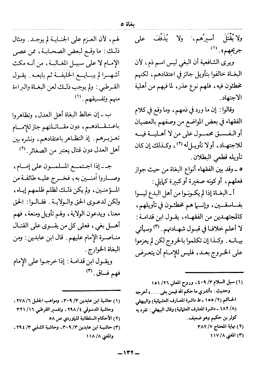 (1) سبل السلام 3 / 409، وروح المعاني 26 / 151 وحديث: " أتدري ما حكم الله فيمن بغي. . . " أخرجه الحاكم (2 / 155 ـ ط دائرة المعارف العثمانية) والبيهقي (8 / 182 ـ دائرة المعارف العثمانية) وقال البيهقي: تفرد به كوثر بن حكيم وهو ضعيف.