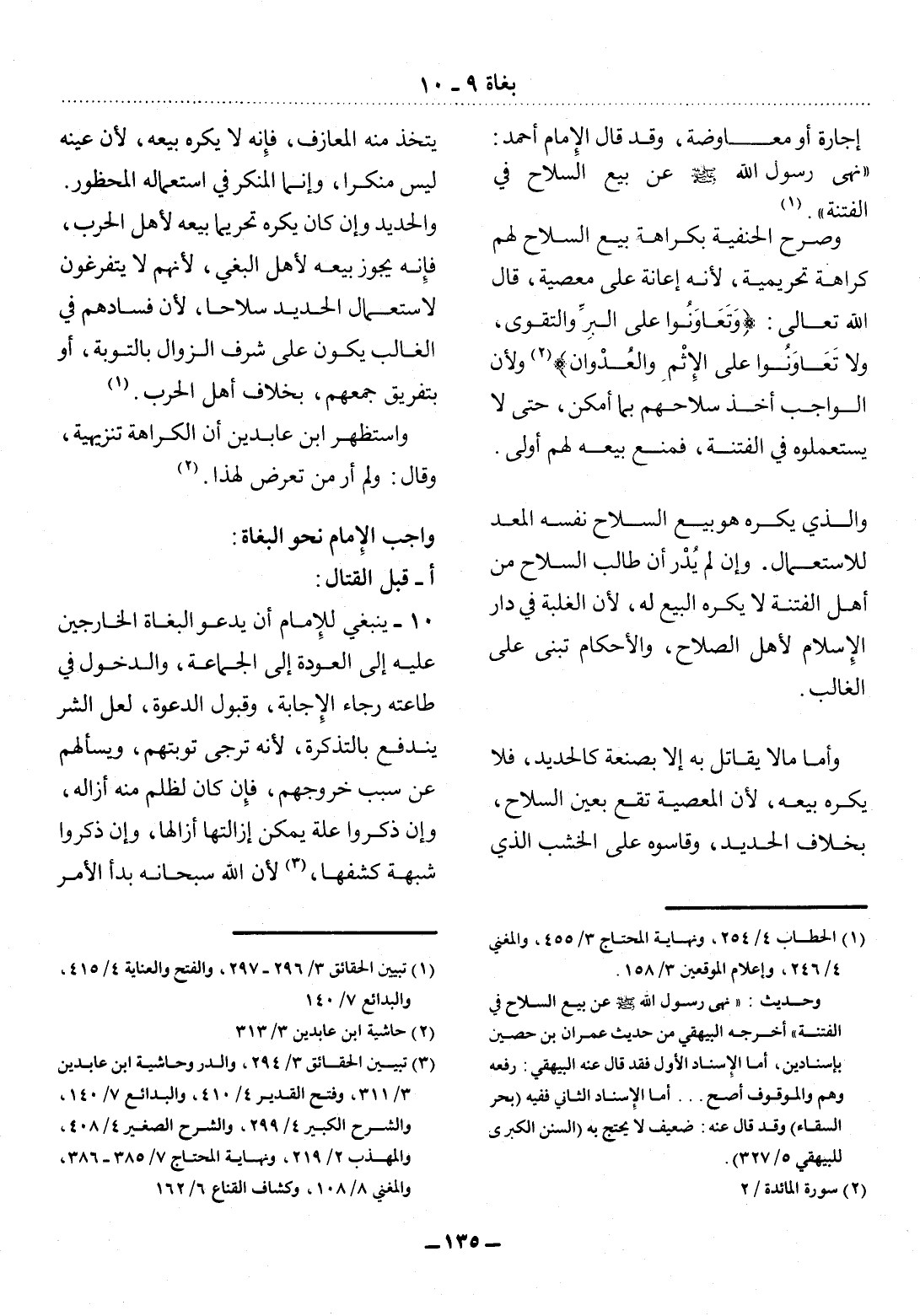(1) الحطاب 4 / 254، ونهاية المحتاج 3 / 455، المغني 4 / 246، وإعلام الموقعين 3 / 158. وحديث: " نهى رسول الله صلى الله عليه وسلم عن بيع السلاح في الفتنة " أخرجه البيهقي من حديث عمران بن حصين بإسنادين، أما الإسناد الأول فقد قال عنه البيهقي: رفعه وهم الموقوف أصح. . . . أما الإسناد الثاني ففيه (بحر السقاء) وقد قال عنه: ضعيف لا يحتج به (السنن الكبرى للبيهقي 5 / 327) .
