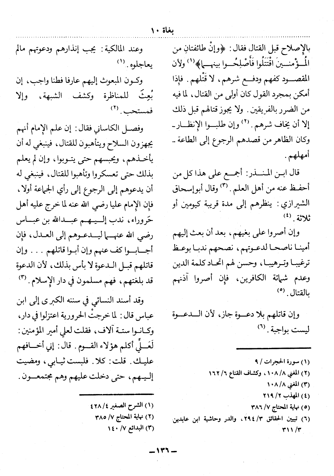 وَإِنْ أَصَرُّوا عَلَى بَغْيِهِمْ، بَعْدَ أَنْ بَعَثَ إِلَيْهِمْ أَمِينًا نَاصِحًا لِدَعْوَتِهِمْ، نَصَحَهُمْ نَدْبًا بِوَعْظٍ تَرْغِيبًا وَتَرْهِيبًا، وَحَسَّنَ لَهُمُ اتِّحَادَ كَلِمَةِ الدِّينِ وَعَدَمَ شَمَاتَةِ الْكَافِرِينَ، فَإِنْ أَصَرُّوا آذَنَهُمْ بِالْقِتَال. (5)