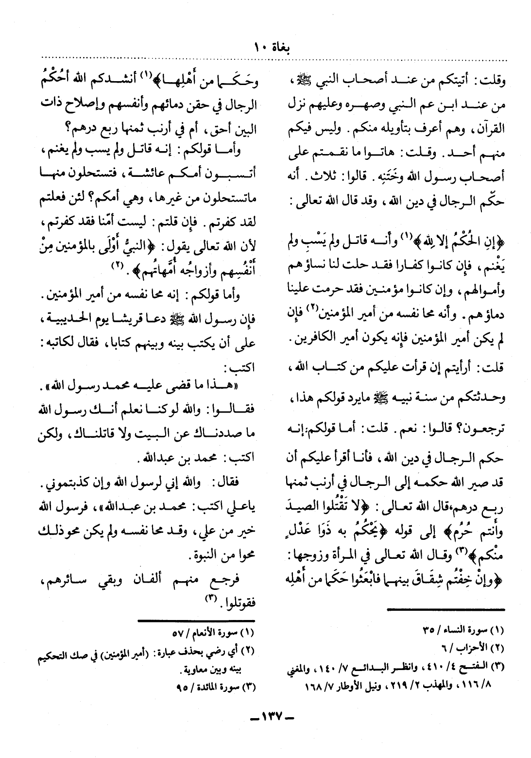 وَقُلْتُ: أَتَيْتُكُمْ مِنْ عِنْدِ أَصْحَابِ النَّبِيِّ صَلَّى اللَّهُ عَلَيْهِ وَسَلَّمَ مِنْ عِنْدِ ابْنِ عَمِّ النَّبِيِّ وَصِهْرِهِ وَعَلَيْهِمْ نَزَل الْقُرْآنُ، وَهُمْ أَعْرَفُ بِتَأْوِيلِهِ مِنْكُمْ. وَلَيْسَ فِيكُمْ مِنْهُمْ أَحَدٌ. وَقُلْتُ: هَاتُوا مَا نَقَمْتُمْ عَلَى أَصْحَابِ رَسُول اللَّهِ وَخَتَنِهِ. قَالُوا: ثَلاَثٌ. أَنَّهُ حَكَّمَ الرِّجَال فِي دِينِ اللَّهِ، وَقَدْ قَال اللَّهُ تَعَالَى: {إِنِ الْحُكْمُ إِلاَّ لِلَّهِ} (1) وَأَنَّهُ قَاتَل وَلَمْ يَسْبِ وَلَمْ يَغْنَمْ، فَإِنْ كَانُوا كُفَّارًا فَقَدْ حَلَّتْ لَنَا نِسَاؤُهُمْ وَأَمْوَالُهُمْ، وَإِنْ كَانُوا مُؤْمِنِينَ فَقَدْ حَرُمَتْ عَلَيْنَا دِمَاؤُهُمْ. وَأَنَّهُ مَحَا نَفْسَهُ مِنْ أَمِيرِ الْمُؤْمِنِينَ (2) فَإِنْ لَمْ يَكُنْ أَمِيرَ الْمُؤْمِنِينَ فَإِنَّهُ يَكُونُ أَمِيرَ الْكَافِرِينَ. قُلْتُ: أَرَأَيْتُمْ إِنْ قَرَأْتُ عَلَيْكُمْ مِنْ كِتَابِ اللَّهِ، وَحَدَّثْتُكُمْ مِنْ سُنَّةِ نَبِيِّهِ صَلَّى اللَّهُ عَلَيْهِ وَسَلَّمَ مَا يَرُدُّ قَوْلَكُمْ هَذَا، تَرْجِعُونَ؟ قَالُوا: نَعَمْ. قُلْتُ: أَمَّا قَوْلُكُمْ: إِنَّهُ حَكَّمَ الرِّجَال فِي دِينِ اللَّهِ، فَأَنَا أَقْرَأُ عَلَيْكُمْ أَنْ قَدْ صَيَّرَ اللَّهُ حُكْمَهُ إِلَى الرِّجَال فِي أَرْنَبٍ ثَمَنُهَا رُبُعُ دِرْهَمٍ، قَال اللَّهُ تَعَالَى: {لاَ تَقْتُلُوا الصَّيْدَ وَأَنْتُمْ حُرُمٌ} إِلَى قَوْلِهِ {يَحْكُمُ بِهِ ذَوَا عَدْلٍ مِنْكُمْ} (3) وَقَال اللَّهُ تَعَالَى فِي الْمَرْأَةِ وَزَوْجِهَا: {وَإِنْ خِفْتُمْ شِقَاقَ بَيْنِهِمَا فَابْعَثُوا حَكَمًا مِنْ أَهْلِهِ