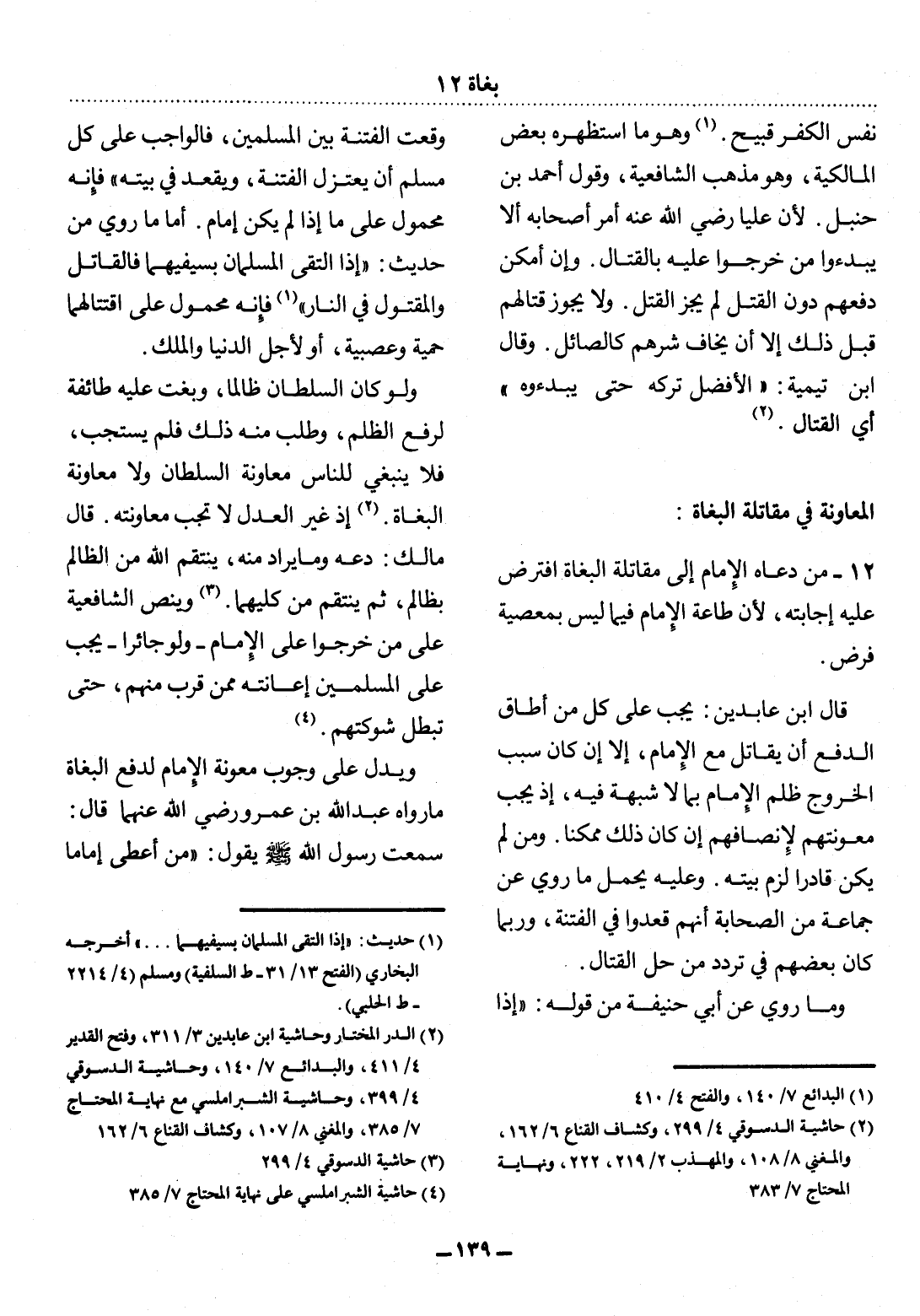 12 - مَنْ دَعَاهُ الإِْمَامُ إِلَى مُقَاتَلَةِ الْبُغَاةِ افْتُرِضَ عَلَيْهِ إِجَابَتُهُ؛ لأَِنَّ طَاعَةَ الإِْمَامِ فِيمَا لَيْسَ بِمَعْصِيَةٍ فَرْضٌ.
