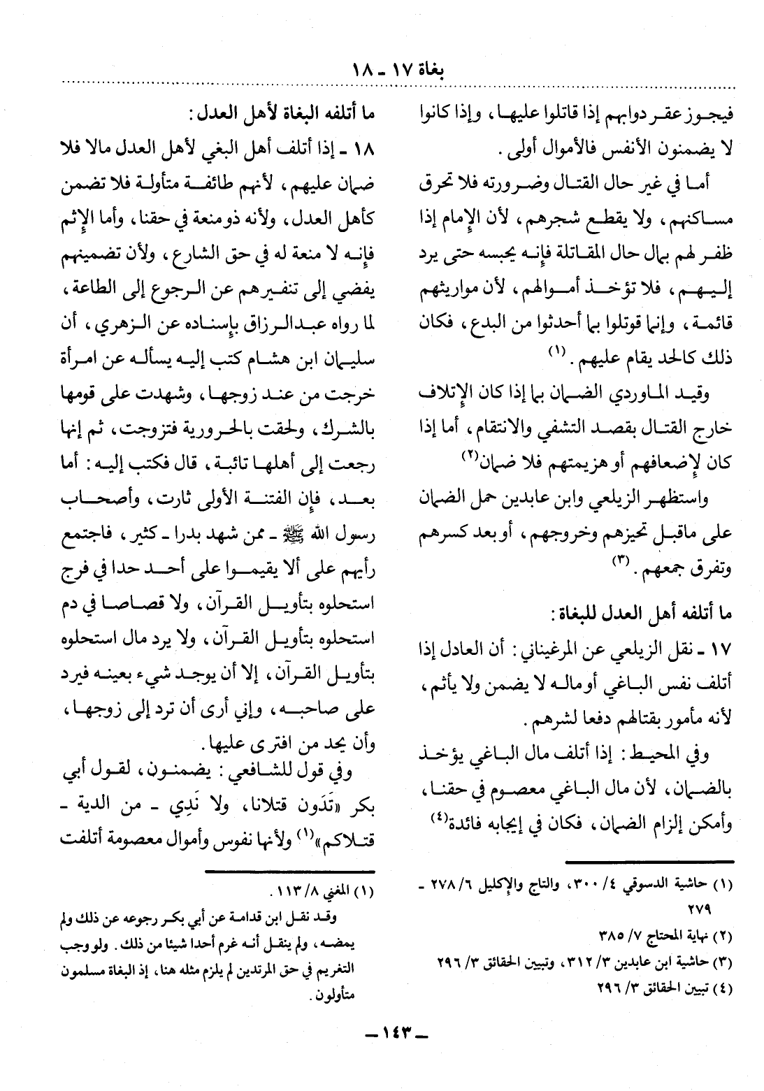 17 - نَقَل الزَّيْلَعِيُّ عَنِ الْمَرْغِينَانِيِّ: أَنَّ الْعَادِل إِذَا أَتْلَفَ نَفْسَ الْبَاغِي أَوْ مَالَهُ لاَ يَضْمَنُ وَلاَ يَأْثَمُ؛ لأَِنَّهُ مَأْمُورٌ بِقِتَالِهِمْ دَفْعًا لِشَرِّهِمْ. وَفِي الْمُحِيطِ: إِذَا أَتْلَفَ مَال الْبَاغِي يُؤْخَذُ بِالضَّمَانِ؛ لأَِنَّ مَال الْبَاغِي مَعْصُومٌ فِي حَقِّنَا، وَأَمْكَنَ إِلْزَامُ الضَّمَانِ، فَكَانَ فِي إِيجَابِهِ فَائِدَةٌ (4)